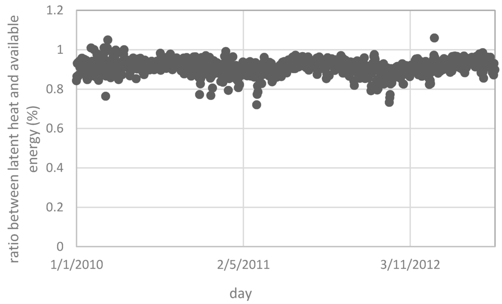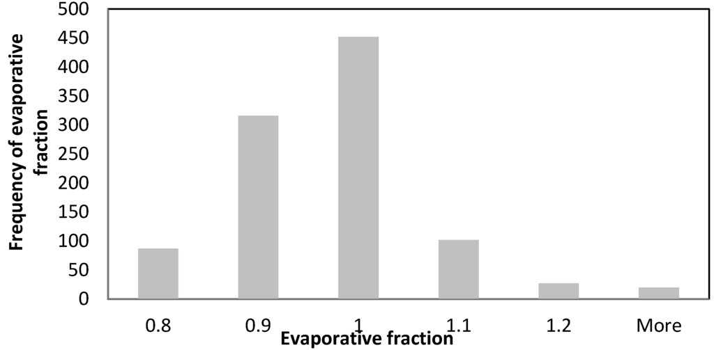 It was found that the average daily evaporative fraction over the Mediterranean Sea in the period between January 2010 and September 2012 had mostly high values, as most of the available energy was converted to latent heat. The histogram in Figure 2 illustrates that the evaporative fraction ranges mostly between 0.8 and 1.2. Values lower than 1.0 occur when sensible heat has a positive value (unstable condition), and higher than 1.0 occur when the sensible heat has a negative value (stable condition). The latent heat under stable conditions dissipates energy from the stored heat in the water body. In the same regard, the ratio between the latent heat and the available energy at the surface is mostly higher than 0.8, i.e., more than 80% of the available energy at the water surface during the day is used in the evaporation process (Figure 3). The standard deviation of evaporative fraction was found to be 0.05, which confirms the stability of this parameter under different atmospheric conditions. This can be explained in terms of stability of the latent heat and available energy over the water surfaces throughout the day [35]. It can therefore be deduced that the evaporative fraction defined at overpass time of the satellite can be used to upscale evaporation rate estimation from instantaneous to a daily basis over water surfaces.
