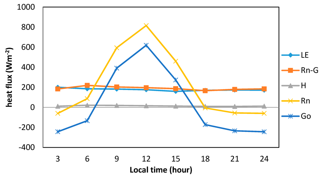 G0 represents the energy used to heat the ground. Over land, G0 is calculated as a function of the surface properties [3]. In many SEBS applications, ground and water cover is not differentiated. Simple approximation for water bodies was suggested by [9] as G0 = 0.5 Rn (W·m−2). However, the measurements done over Ijsselmeer and Tana lakes showed that G0 is not constant in space and time over a water surface.