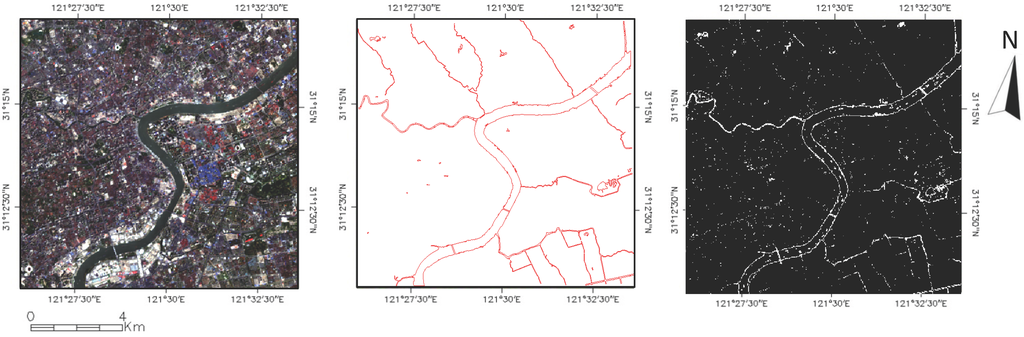 All of the OLI images used in this study were free of clouds, and atmospheric correction using the Fast Line-of-sight Atmospheric Analysis of Spectral Hypercubes (FLAASH) module was applied to all of the selected scenes. The coastal/aerosol band (band 1 of OLI) and the cirrus band (band 9 of OLI), which include little information under cloudless conditions, were removed and the remaining six bands were used in the experiments. To obtain the reference data (true water fraction of each pixel), fine spatial resolution images (<1 m) were acquired from Google EarthTM. The acquisition dates between the Google EarthTM images and the test images could be considered to be closely matched, since the water bodies in urban areas are usually stable over a short time period, so the slight bias of the surface water boundaries between the reference data and test images could be ignored. The “true” boundaries of all the water bodies in the study areas were digitized manually on-screen and used for the accuracy assessment of the water body subpixel mapping. The OLI images were registered to the reference images using a first order polynomial with at least 20 ground control points in each scene, with root-mean-square errors (RMSEs) of 0.23, 0.3, 0.22, and 0.29 pixels, corresponding to the test sites of Beijing, Shanghai, Hangzhou, and Guangzhou, respectively.