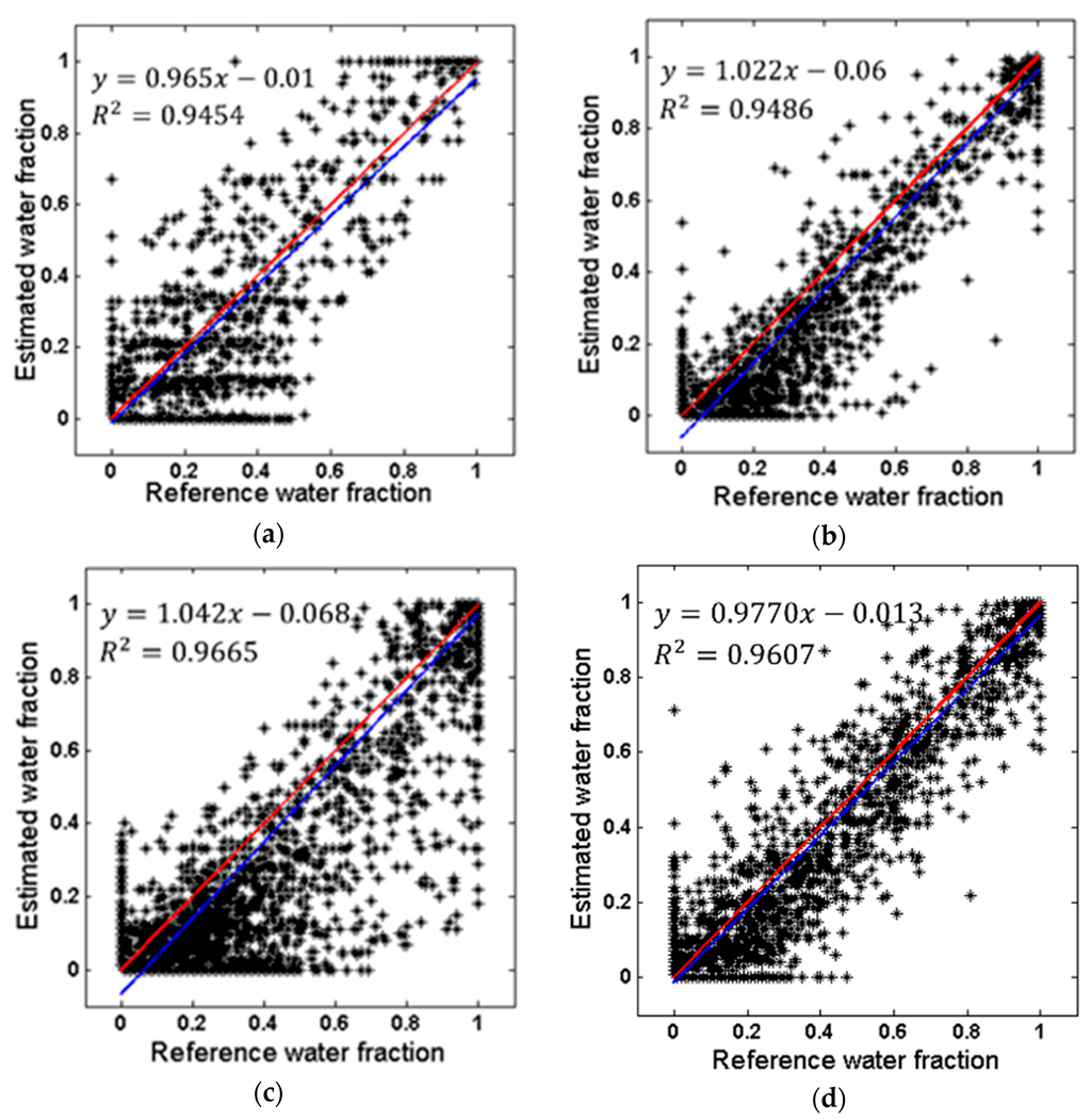 Comparison between the reference and estimated water fractions obtained by ASWM, where the red line is the 1:1 reference line, and the blue line is the regression line. (a–d) represent the results for the study areas of Beijing, Shanghai, Hangzhou, and Guangzhou, respectively.