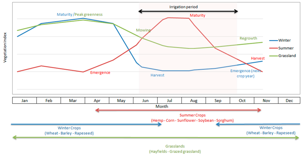 To evaluate the robustness of the proposed approach, a temporal window going from February to June was used. It covered the growing stages of winter crops until the beginning of the growing period of summer crops and their irrigation (Figure 2).