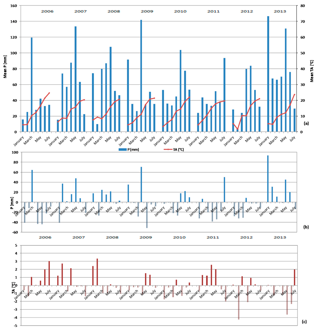 (a) Precipitations (P) in mm, air temperature (TA) in °C for 2006 to 2013; (b) Precipitations: difference between the monthly average and the monthly average over 8 years; (c) Air temperature: difference between the monthly average and the monthly average over 8 years.
