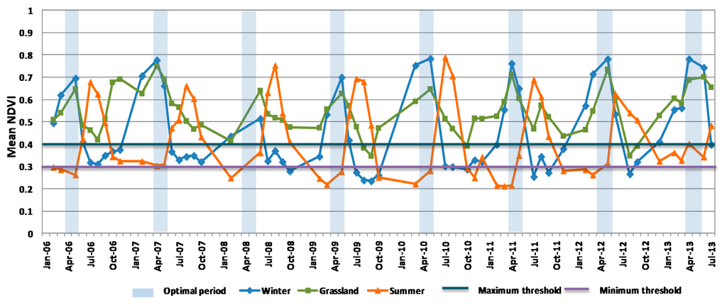 Mean NDVI profiles of all monitored plots for winter crop (blue line), grassland (green line) and summer crop (orange line) for 2006 to 2013. The optimal period (Days 90 to 150) appears in blue, the maximum threshold NDVI value in dark green and the minimum threshold NDVI value in purple.