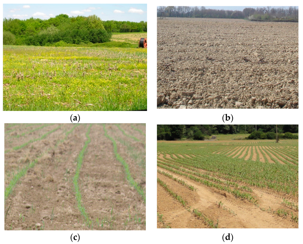 Examples of observed surface states in early spring: (a) vegetated soil (crop regrowth and self-sown plants); (b) bare soil; (c) emergence; (d) vegetated soil (corn at first phenological stage).