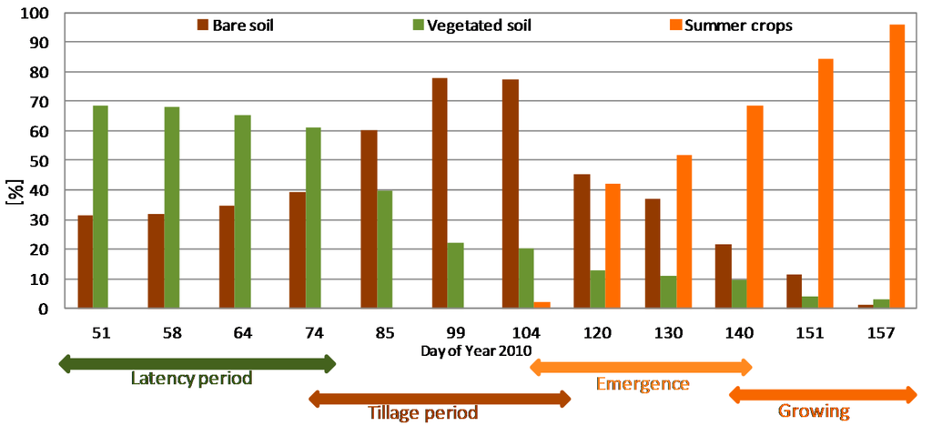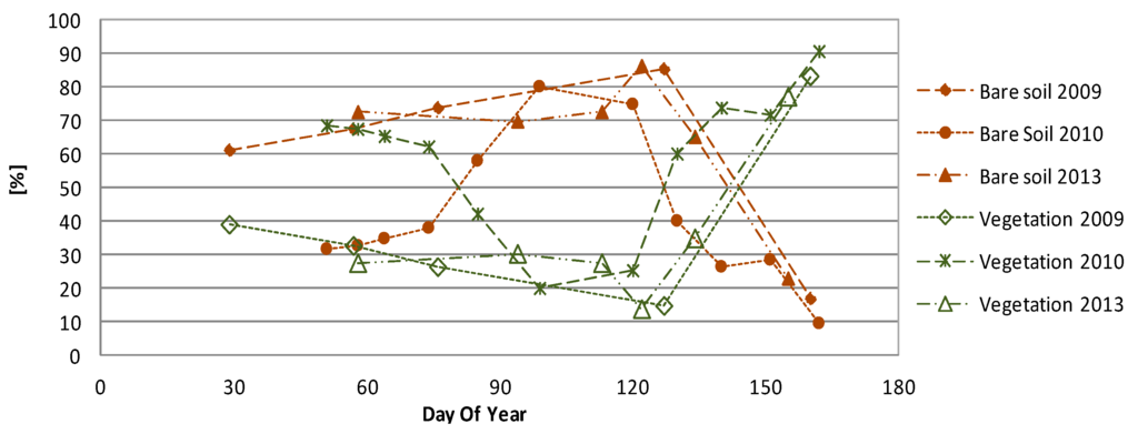 Fraction of soil and vegetated crop plots over the total area representing the monitored summer crops during 2009, 2010 and 2013.