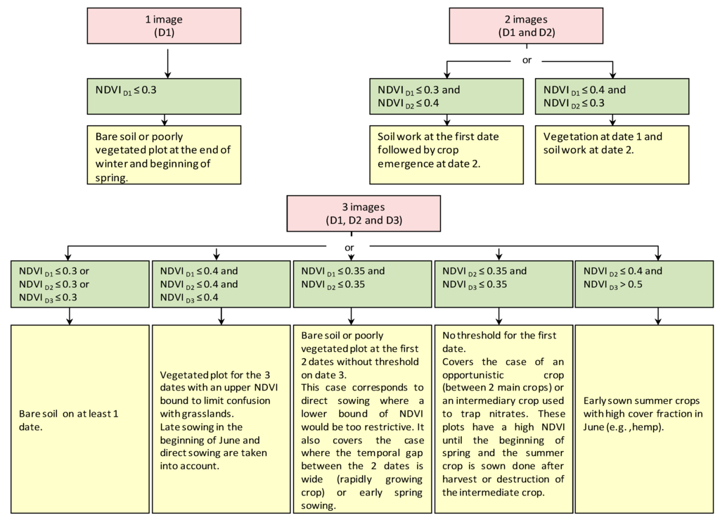 The proposed method for the detection of summer crops is based on a decision tree using thresholds on NDVI values (with values provided by the preliminary analysis). It uses 1 to 3 dates, which are added chronologically.