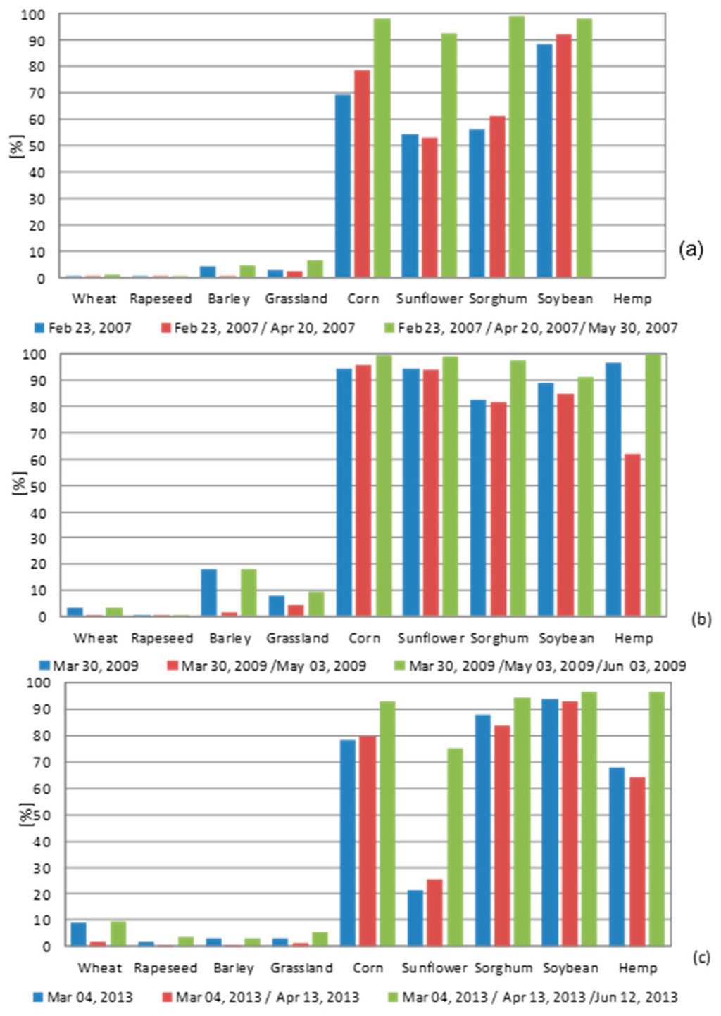 Regarding the summer crops that are rarely irrigated (hemp, sorghum and sunflower), accurate detection needs three dates (Figure 9). For hemp, this is due to the fact that it is sown in April–May and its cover fraction is high (about 90%, 3 weeks after emergence) with an average NDVI of 0.4. The quality of the detection of hemp depends on the date of the first image and on the time between the first and second dates. Note that no hemp was followed in 2007.