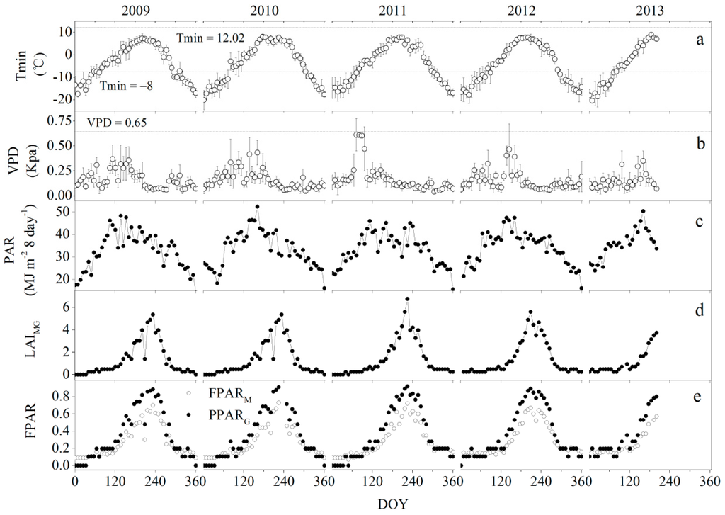 Seasonal variation of ground meteorological measurements data and the FPAR from 2009 to 2013. All data are integrated into 8-day time step and showed with the first day of each 8-day interval, the error bars in (a) and (b) are standard deviation for corresponding mean values. (a), Tmin is the daily minimum temperature; (b), VPD is the daily vapor pressure deficit; (c), PAR is photosynthetically active radiation; (d), the consecutive LAIMG is derived from linear regression between ground LAIG measurements and MODIS LAI (LAIM) in LAIG measurement days (n = 23); (e), FPARM is directly obtained from MODIS products, while FPARG is calculated from LAIG in e based on Beer-Lambert law.