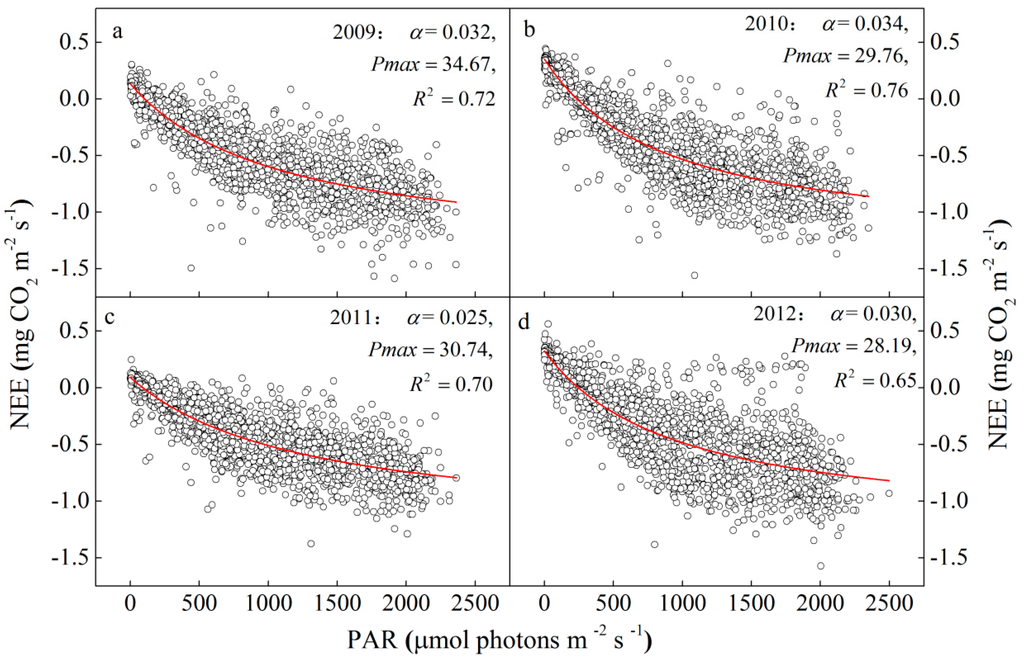 The maximum light use efficiency estimation using the light response curve derived from the Michaelis-Menten equation based on daytime EC measurement data from 2009 to 2012 (a–d). The Pmax (μmol CO2 m−2 s−1) is the maximum ecosystem photosynthesis rate. α (μmol CO2 μmol photons−1) is the maximum light use efficiency.