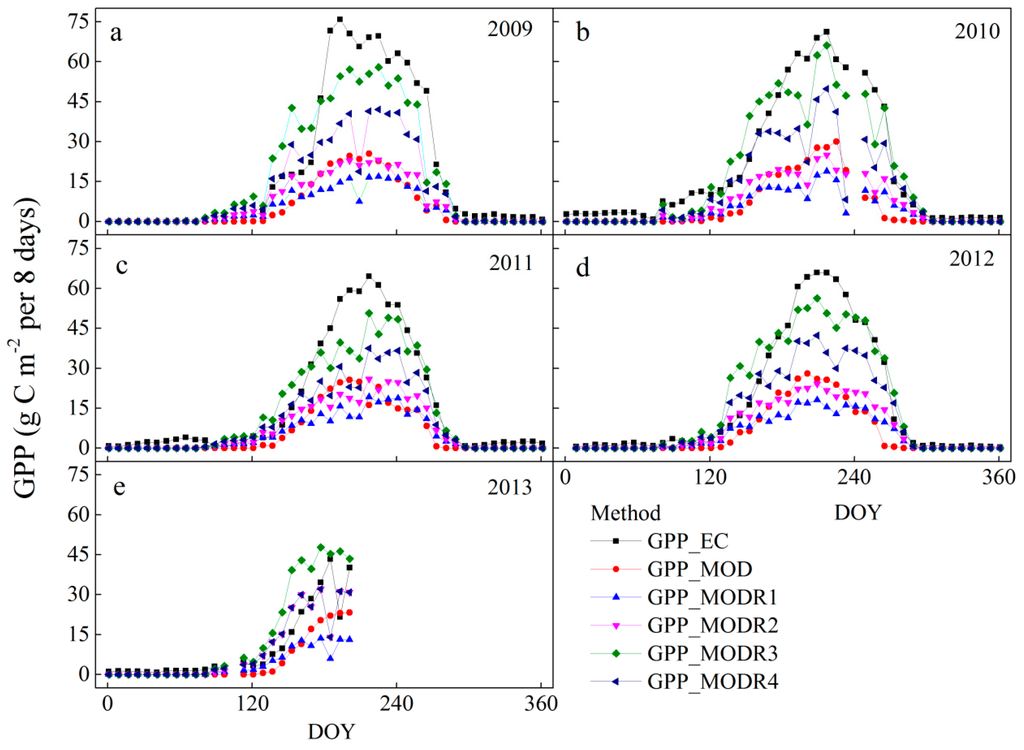 Seasonal variation of the field GPP measurement (GPP_EC) and five MODIS-based GPP estimations (GPP_MOD, GPP_MODR1, GPP_MODR2, GPP_MODR3, and GPP_MODR4) showed similar tendency but with different quantities in all observational years, especially in growing season (Figure 3a–e). GPP_EC was generally greater than any other GPP estimation from the MOD17A2 algorithm, which indicated that all MODIS-based GPP estimations in this site were underestimated in predicting GPP. GPP_MODR3 got the closest agreement with GPP_EC estimation, GPP_MODR4 took the second place, and the rest MODIS-based GPP estimations (GPP_MOD, GPP_MODR1, and GPP_MODR2) strongly underestimated GPP in this alpine wetland with corresponding values less than half of GPP_EC estimation (Figure 3).