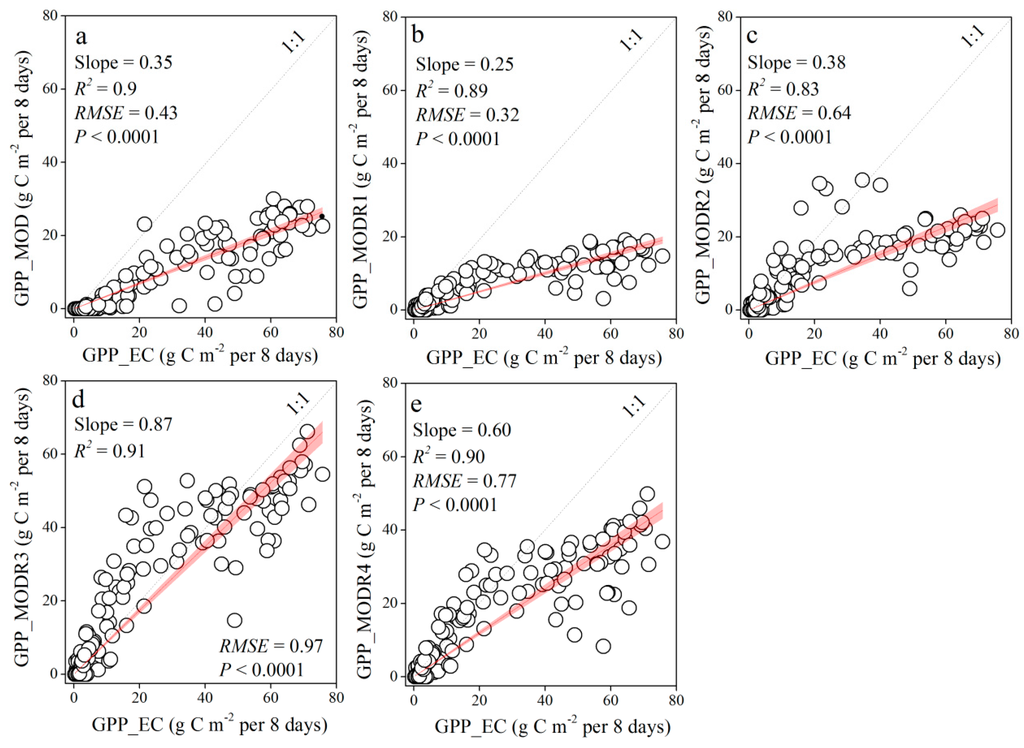 This study utilized the MOD17A2 algorithm and tower-based ground measurements to reconcile MODIS default GPP estimation (GPP_MOD) in four GPP estimation models, GPP_MODR1 to GPP_MODR4, depending on the diverse parameterization schemes (Table 1). We assessed the performance of these models on GPP estimations as compared to in situ flux tower GPP (GPP_EC).