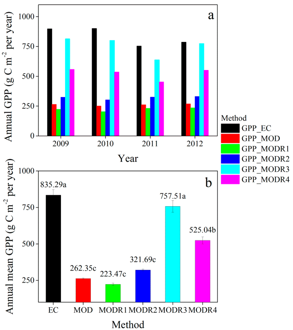 Inter-annual GPP variations from the field GPP measurement (GPP_EC) and five MODIS-based GPP estimations (GPP_MOD, GPP_MODR1, GPP_MODR2, GPP_MODR3, and GPP_MODR4) (a) and the difference among different estimation methods (b). The error bars in b are the standard deviation of the mean annual GPP estimation from 2009 to 2012. The bar with the same lowercase indicates no significant difference among diverse GPP estimation methods (p > 0.05).