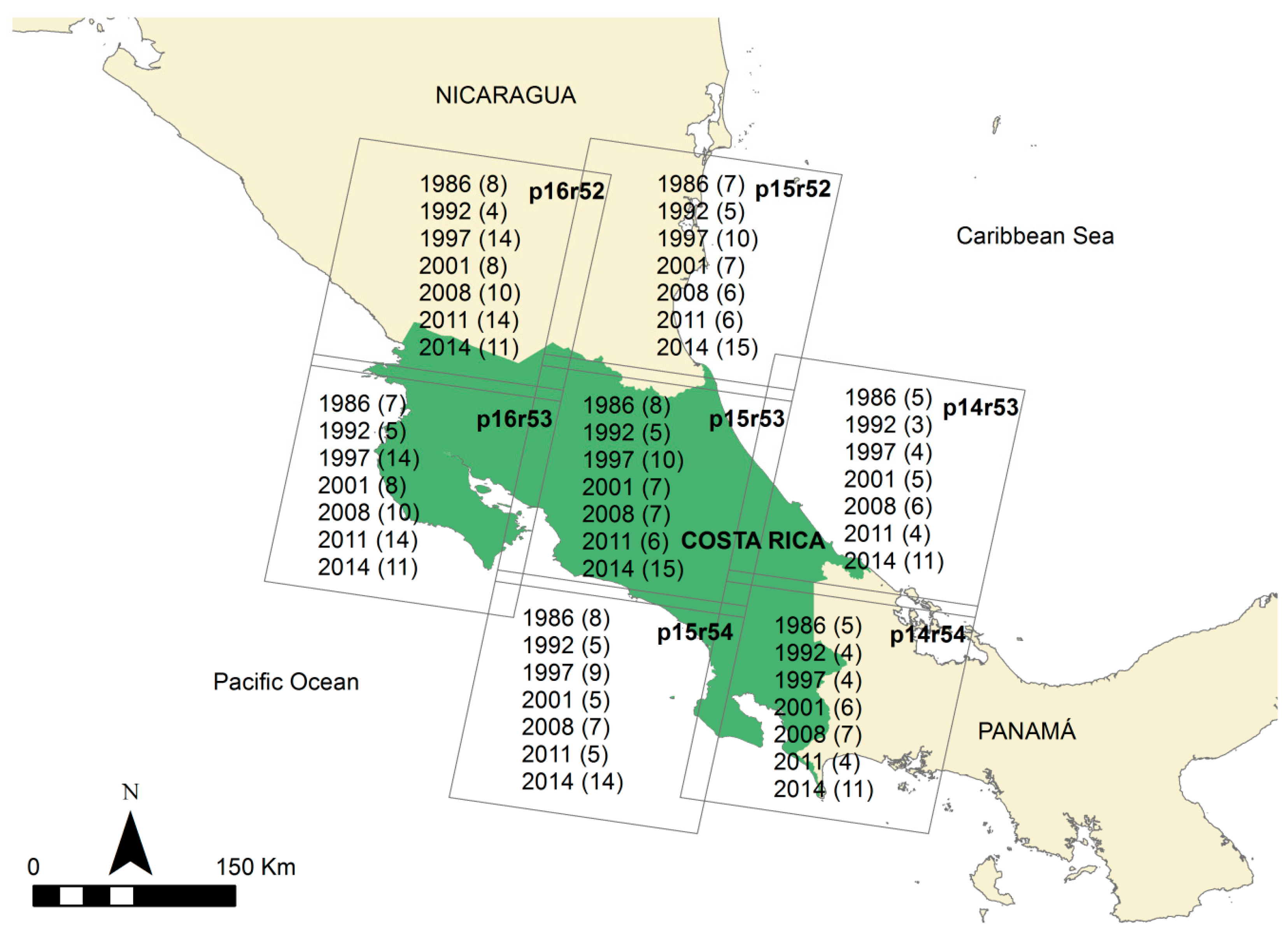 Full coverage of Costa Rica requires seven Landsat tiles (paths 14–16 and rows 52–54) (Figure 1). The combination of multiple images for each date and tile was necessary in order to reduce the percentage of cloud cover and cloud shadows in the final maps, yet only images within a 14 month range were considered in order to ensure temporal consistency as suggested under the Verified Carbon Standard Jurisdictional and Nested REDD+ (VCS-JNR) protocols. For this reason, the LC maps compiled data over two years (e.g., 1985/1986). A total of 384 Landsat images (30 m resolution) were used to fill the gaps caused by the abundant cloud cover and shadows: 48 from 1985/1986, 31 from 1991/1992, 65 from 1997/1998, 46 from 2000/2001, 53 from 2007/2008, 53 from 2011/2012 and 88 from 2013/2014 (Figure 1). Imagery from Landsat 4 and 5 Thematic Mapper (TM), Landsat 7 Enhanced Thematic Mapper (ETM+) and Landsat 8 Operational Land Imager and Thermal InfraRed Sensor (OLI/TIRS) were used. The images were selected between December and April (dry season) to minimize seasonal variations, except for the tiles in path 16, where some images were selected also from the rainy season to avoid confusion caused by the presence of deciduous forest.