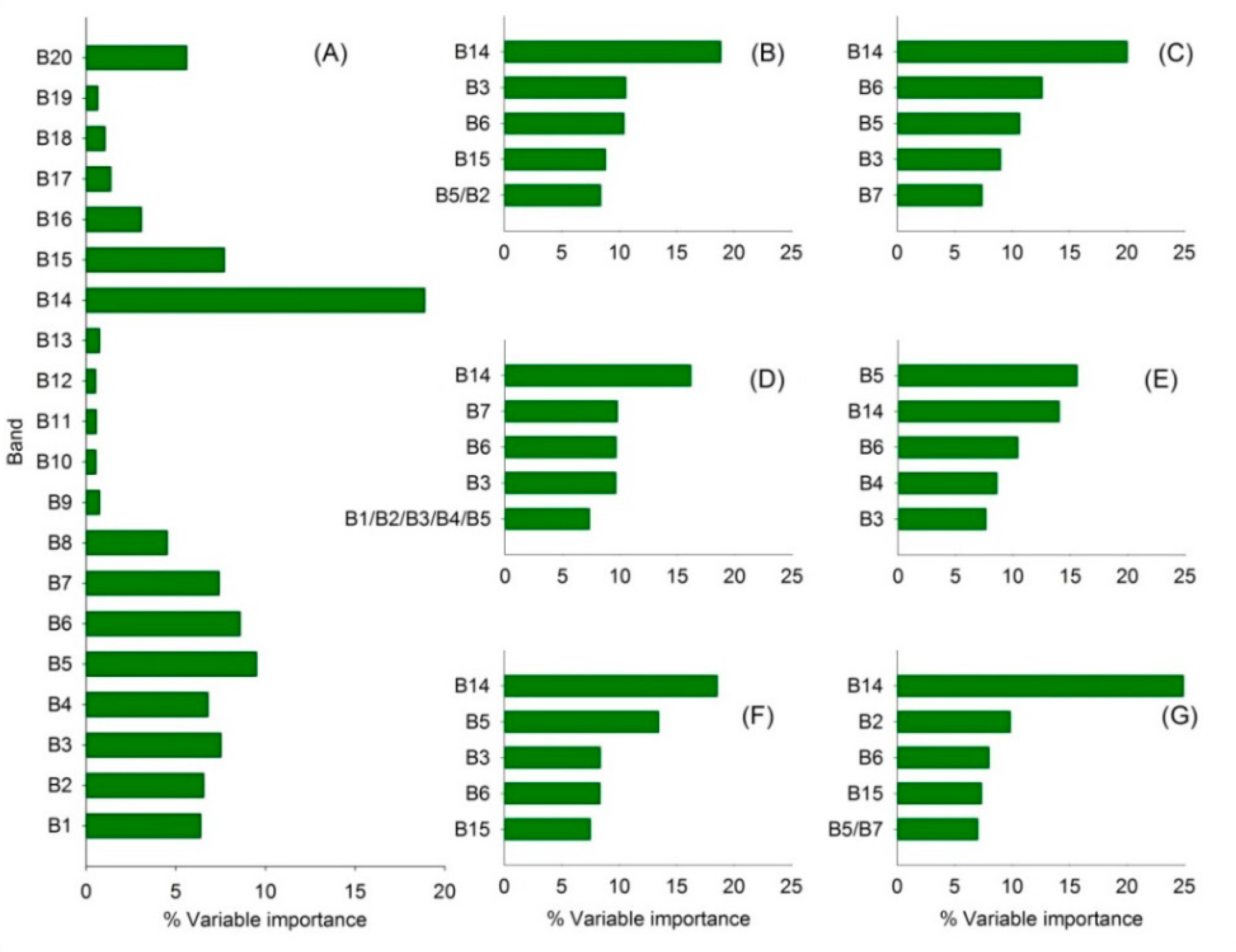 Measurement of the relative variable importance of the predictor variables in the adjusted Random Forests for classifying: (A) complete land cover classification; (B) forest class; (C) palm forest classes; (D) settlement class; (E) grassland class; (F) pineapple class; (G) coffee class.