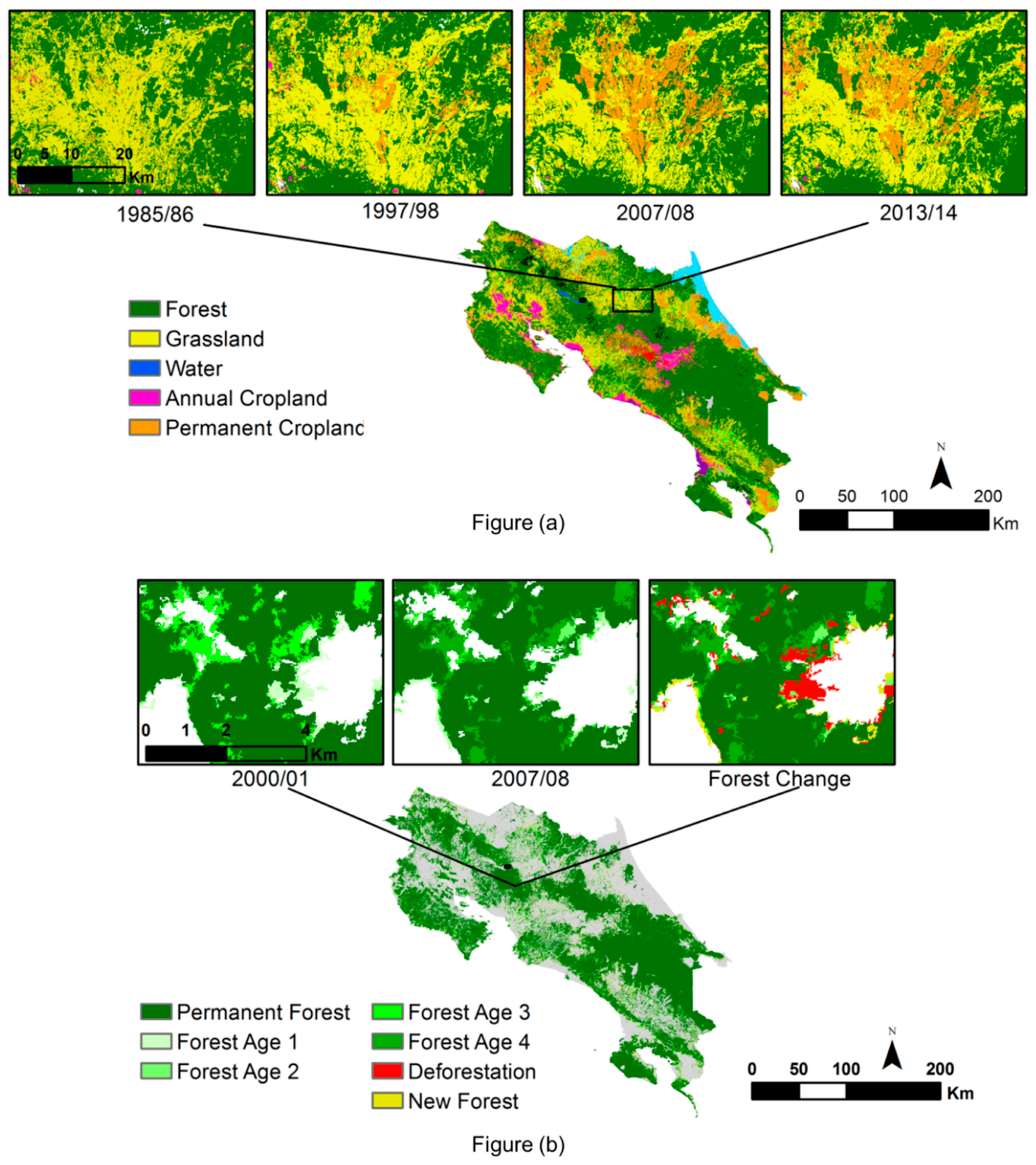 Illustration of land cover change dynamics in sample areas in Costa Rica: (a) Permanent cropland expansion from 1986 to 2013; (b) Forest age class distribution and deforestation patterns over different forest age classes.