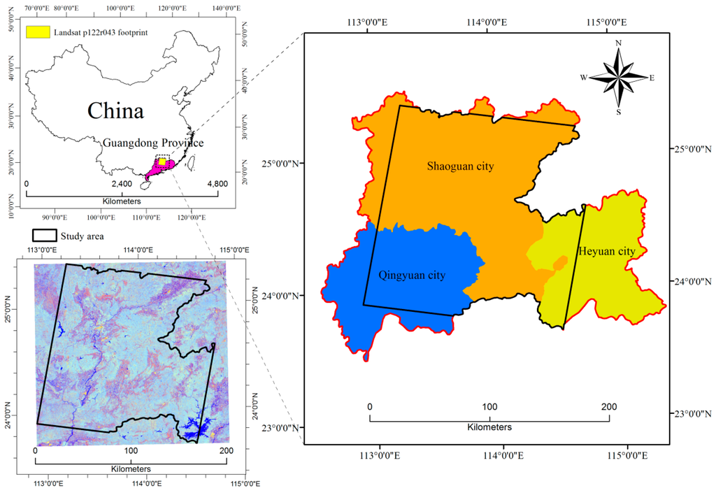 The study area (black region covering 24,275.5 km2) is located in northern Guangdong Province, with a geographical coverage extending from 113.10°E, 23.64°N to 114.75°E, 25.44°N, including the cities of Shaoguan, Qingyuan and Heyuan (Figure 1). The local topography is undulating and its elevation is between 22 and 1353 m above sea level. The rocky desertification process is very typical in northern Guangdong, representing one of the serious rocky desertification areas in China. The climate is a mid-subtropical monsoon climate, with 1300 to 2400 mm of mean annual precipitation and of 18 to 21 °C mean annual temperature. The rainy season takes place from March to August, with approximately 53% of the annual rain falling between April and June. The vegetation includes natural forests and the large scale plantations. The tree cover is dominated by Pinus massoniana, Cunninghamia lanceolata, Pinuselliottii engelm, Eucalyptus, Pinus kwangtungensis, Castanopsis fissa, Acacia mangium and Phyllostachys edulis. Most of these species are considered evergreen and fast-growing. Other minor vegetation consists of deciduous trees and shrubs. The most common meteorological disasters in the region are chilling injury of plants, storms and flooding, and drought.