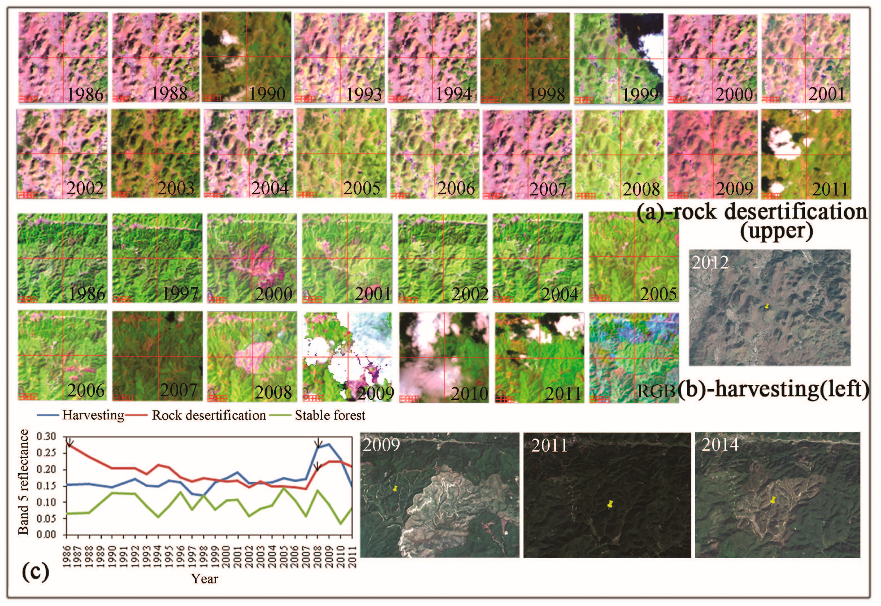 Example of Landsat time series (LTS) imagery (displayed in 5,4,3 false color composite; RGB uses band 5 images from 1984, 2008, and 2011) used to show rock desertification (a); harvesting (b) and spectral trajectories ((c), showing patterns of disturbance with arrows indicating year of onset) used to detect disturbance on random selected plots. A series of high resolution Google Earth photos (white color numbers) were also used to aid the interpretation of the Landsat data.