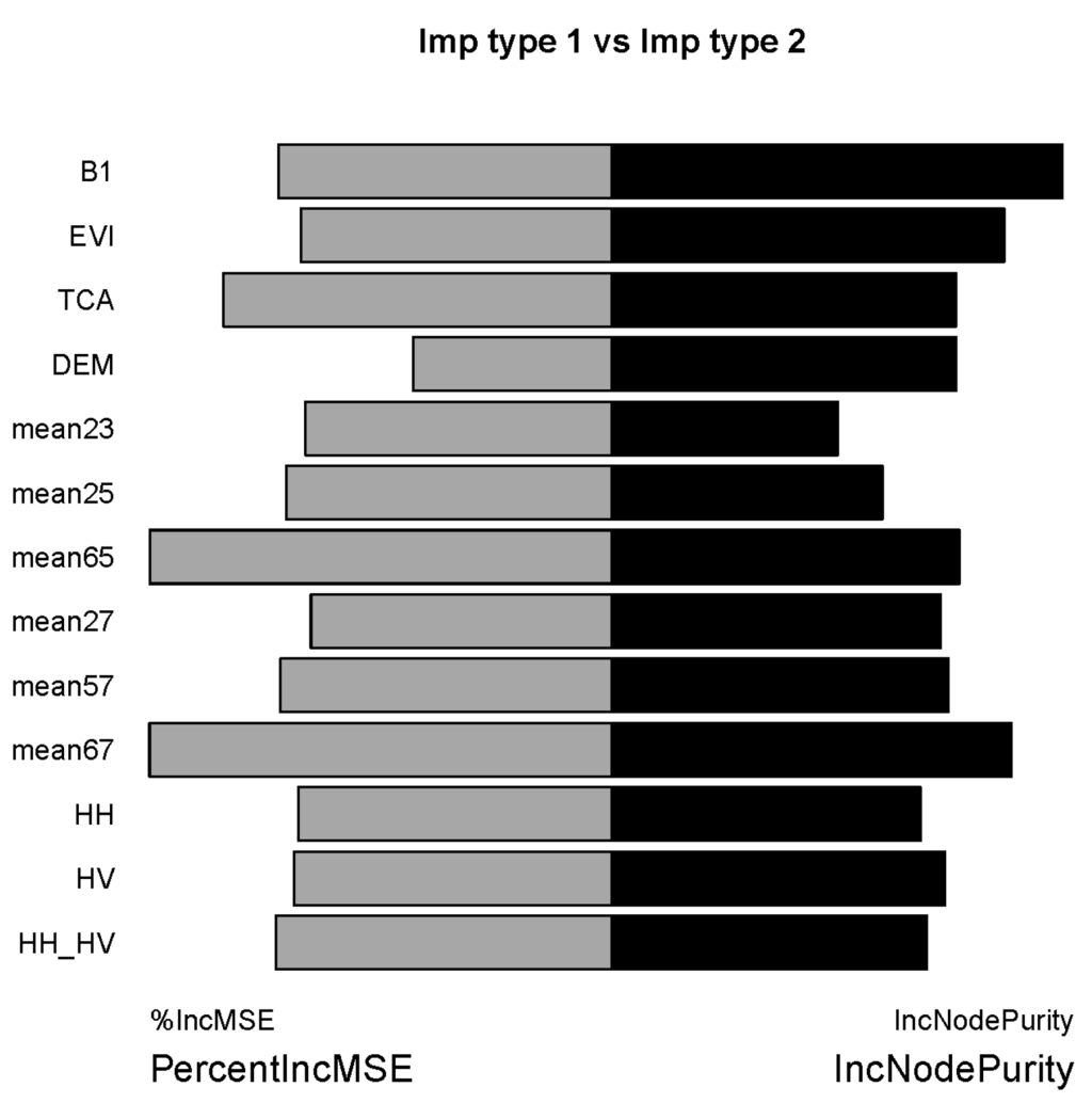 All training data were used for internal model performance evaluation and for deriving two different variable importance measures (VIM) based on the response type. Importance type 1 was calculated by randomly permuting each predictor variable and computing the associated reduction in predictive performance using the ‘out of bag’ (OOB) error for RF models [69] and importance type 2 was calculated using the decrease in node impurities attributable to each predictor variable. The resulting VIM provides means to assess the contribution of each predictor variable to the modeling performance. The higher the percent increase in mean square error (MSE) (PercentIncMSE) and increase in NodePurity (IncNodePurity) indicated a stronger importance of these predictor variables. Mean squared prediction error (MSE) VIM was used to rank all predictor variables [17]. The initial variable ranking (all predictor variables) is used throughout all the iterations. The less important predictor variables were then removed from the model and the small subset of predictor variables was selected to construct the final model and map AGB based on one RF model containing all plot measurements from six years.