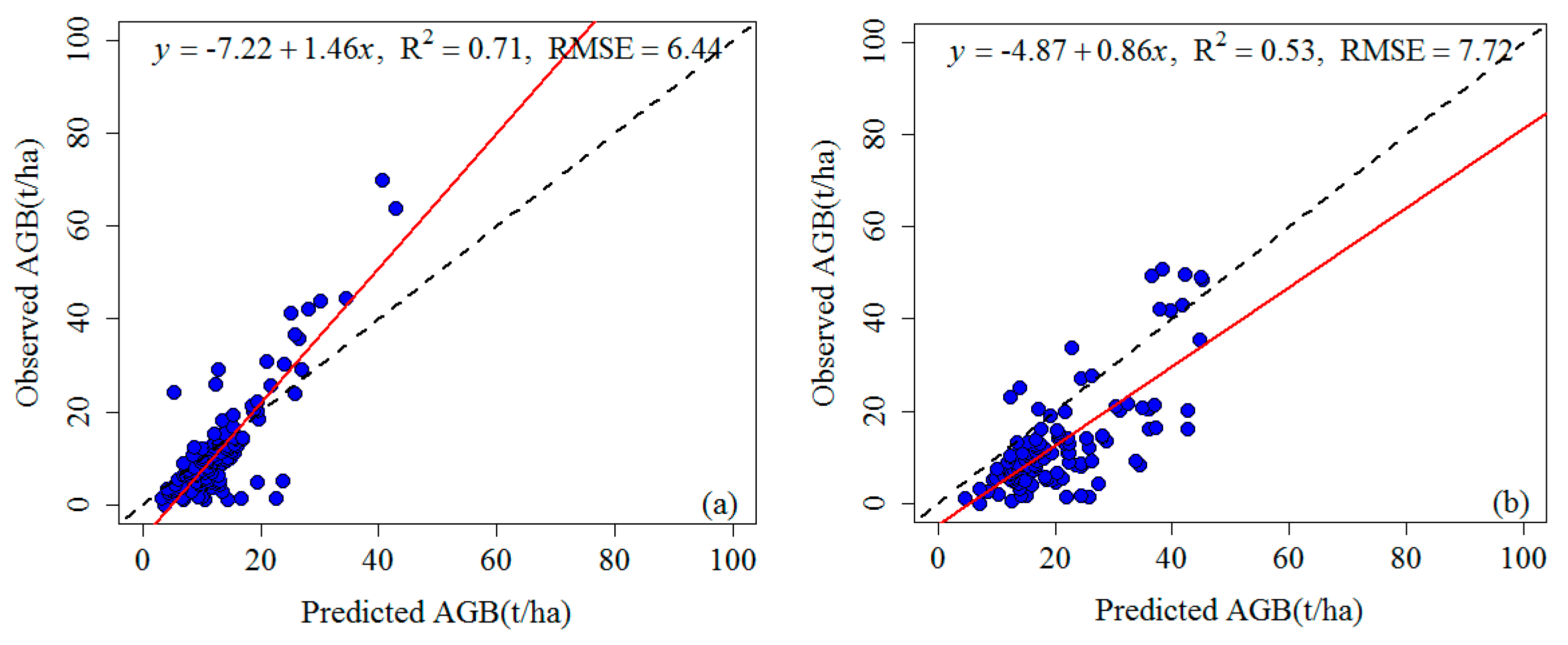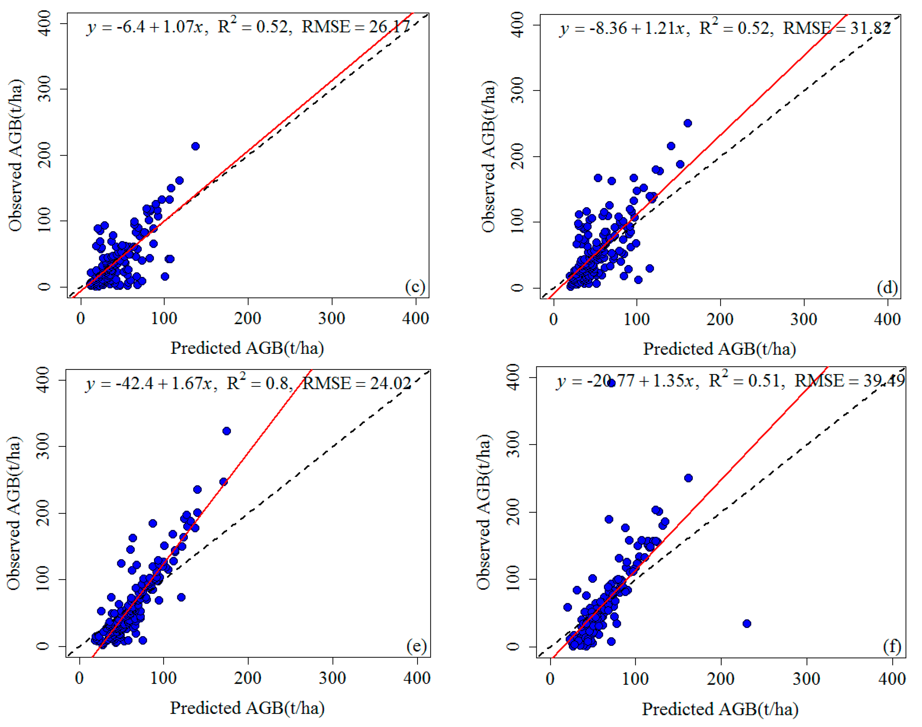 Relationship between predicted and observed aboveground biomass (AGB) using multi-temporal imagery and RF variable selection. (a) 1988; (b) 1992; (c) 1997; (d) 2002; (e) 2006; (f) 2011. The dashed 1:1 line shows the optimal model fit.