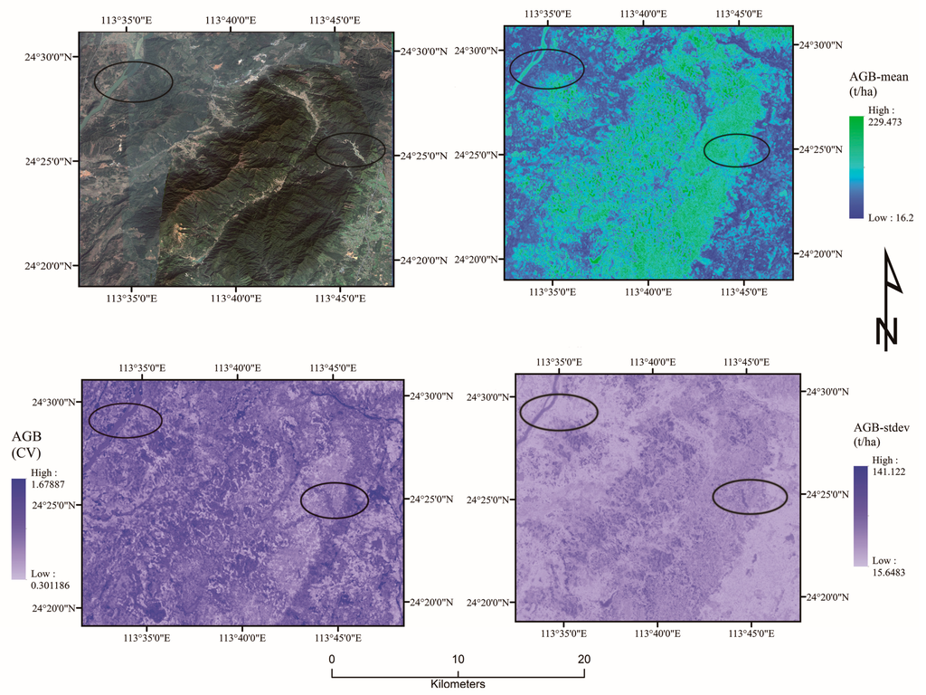 Figure 6 illustrates the Google Earth aerial photo with RF uncertainty regarding the mean, standard deviation and CV in 2011 for regions of northern Guangdong. When the CV value was high, the mean of AGB was low. The map of RF uncertainty highlighted small anomalous areas of high uncertainty. These are localized areas where the predictions from individual trees varied widely, with some of the trees in the RF predicting low AGB and other trees predicting high AGB.