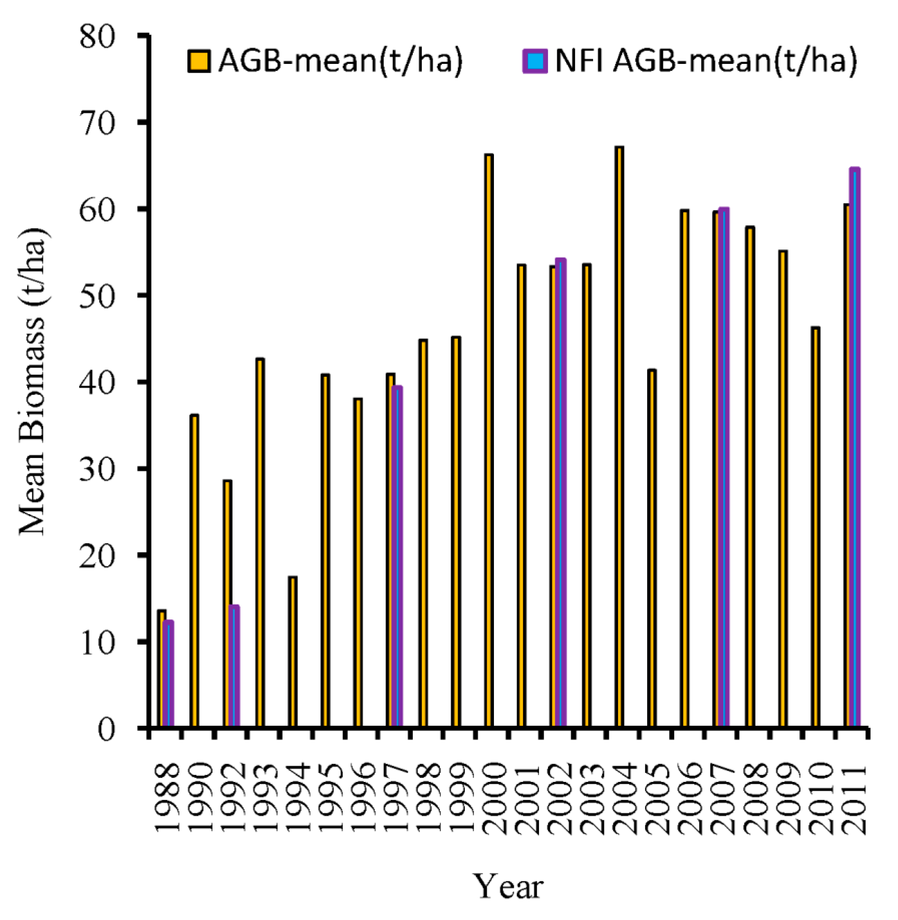 Based on the RF regression modeling results, the scene-level mean AGB time series change trends were derived (Figure 7). The modeled trajectories supported the ascending trend found by the NFI data between 1988 and 2011. In particular, the modeled mean AGB in NFI available years closely approximated the NFI mean AGB data. A strong rising trend of mean AGB from the lowest value of 13.58 t/ha to the highest value of 66.25 t/ha occurred between 1988 and 2000, while after 2000 there was a fluctuating ascending change. The peak value of mean AGB was 67.13 t/ha in 2004.