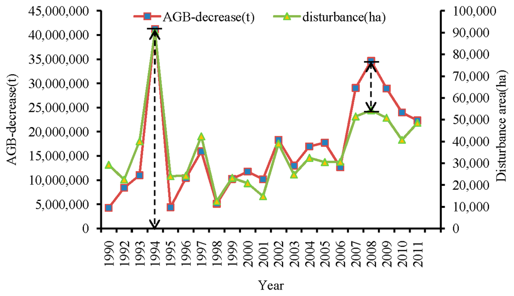 By integrating the AGB change with forest disturbance, the trend in AGB decrease associated with forest disturbance is shown in Figure 8. The trend in disturbance area closely corresponds with the trend in AGB decrease, except for a couple of notable anomalies. Both the disturbance area and AGB decrease spiked in 1994, and a significant spike in AGB decrease occurred in 2008 with a much smaller associated spike in the disturbance area. This divergence presented a clear disagreement with the entire change trend.