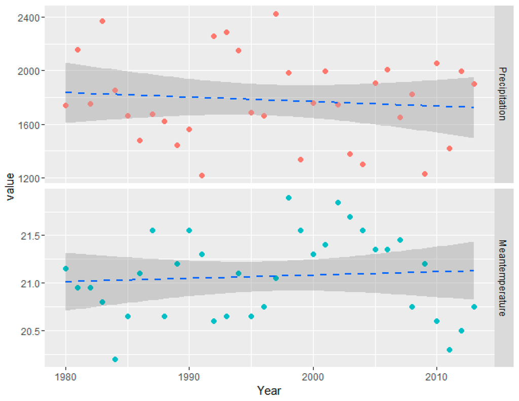 To investigate climate change over northern Guangdong Province, we analyzed trends in the average values of temperature and precipitation of two stations from 1980 to 2013 in this region. During this period, an increasing linear trend in mean annual temperature was found, while a decreasing linear trend in annual precipitation was observed (Figure 9). The change trend predicted the increasing temperature and decreasing precipitation that occurred in this region.