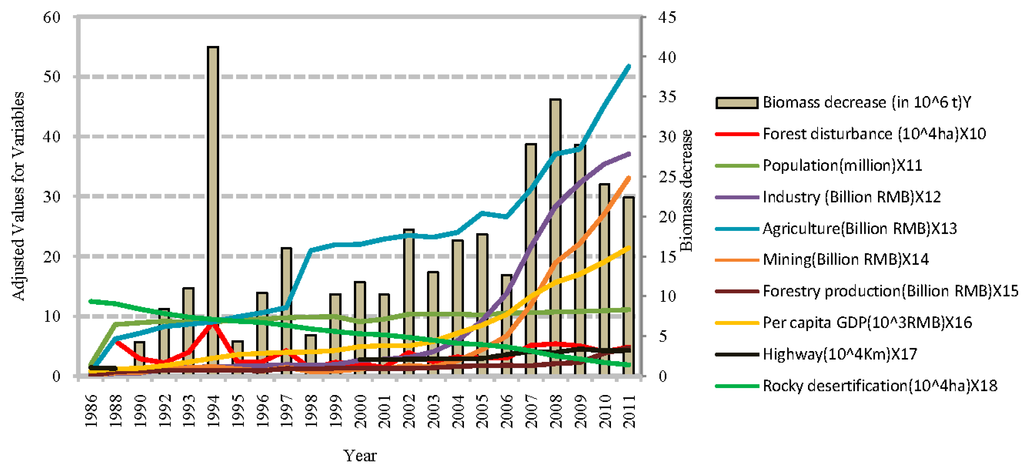 We conducted correlation coefficient analysis of the following nine human activities from 1990 to 2011 in relation to the biomass decrease (Y) in the same period: forest disturbance (logging and fire) (X10), population (X11), industrial production (X12), agricultural production (X13), mining (X14), forestry production (X15), per capita GDP (X16), highway mileage (X17) and rock desertification area (X18) (Figure 10). The correlation coefficients were found in Table 6 (significant correlation at the 0.01 level). This showed that the above factors were significantly directly and indirectly associated with AGB decrease, and the annual forest disturbance and mining changes had a great influence on the AGB dynamics.
