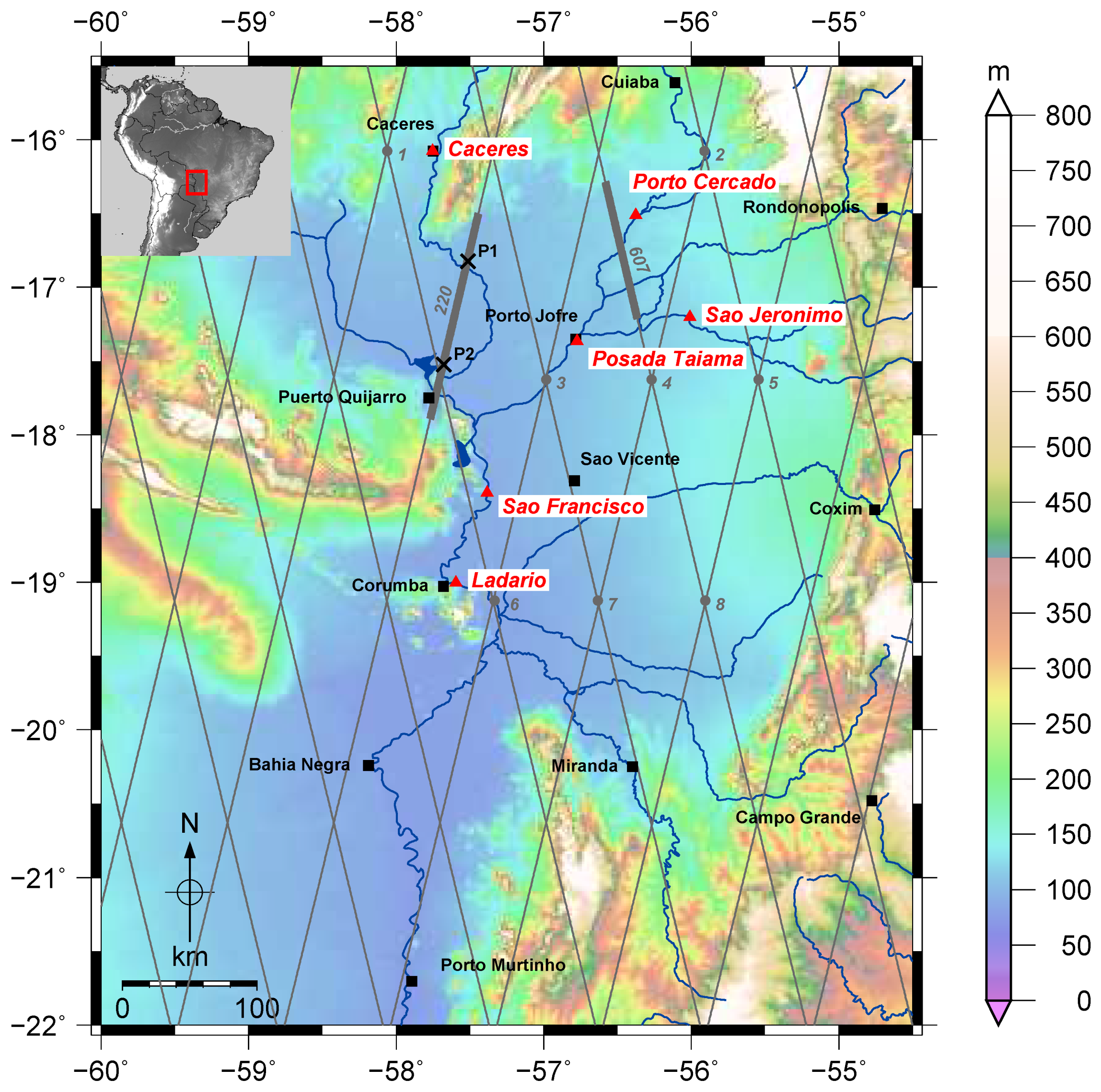 The Pantanal region with main settlements (black squares) and major rivers (blue). Background colors indicate topography taken from ETOPO01 [37]. ENVISAT satellite tracks are shown with gray lines and in situ gauging stations are illustrated by red triangles. Track parts of pass 220 and 607 are highlighted by bold lines. The locations of the stations used in Section 4.3 (P1 and P2) are marked by black crosses. Crossover locations used for validation are numbered and indicated by gray circles.