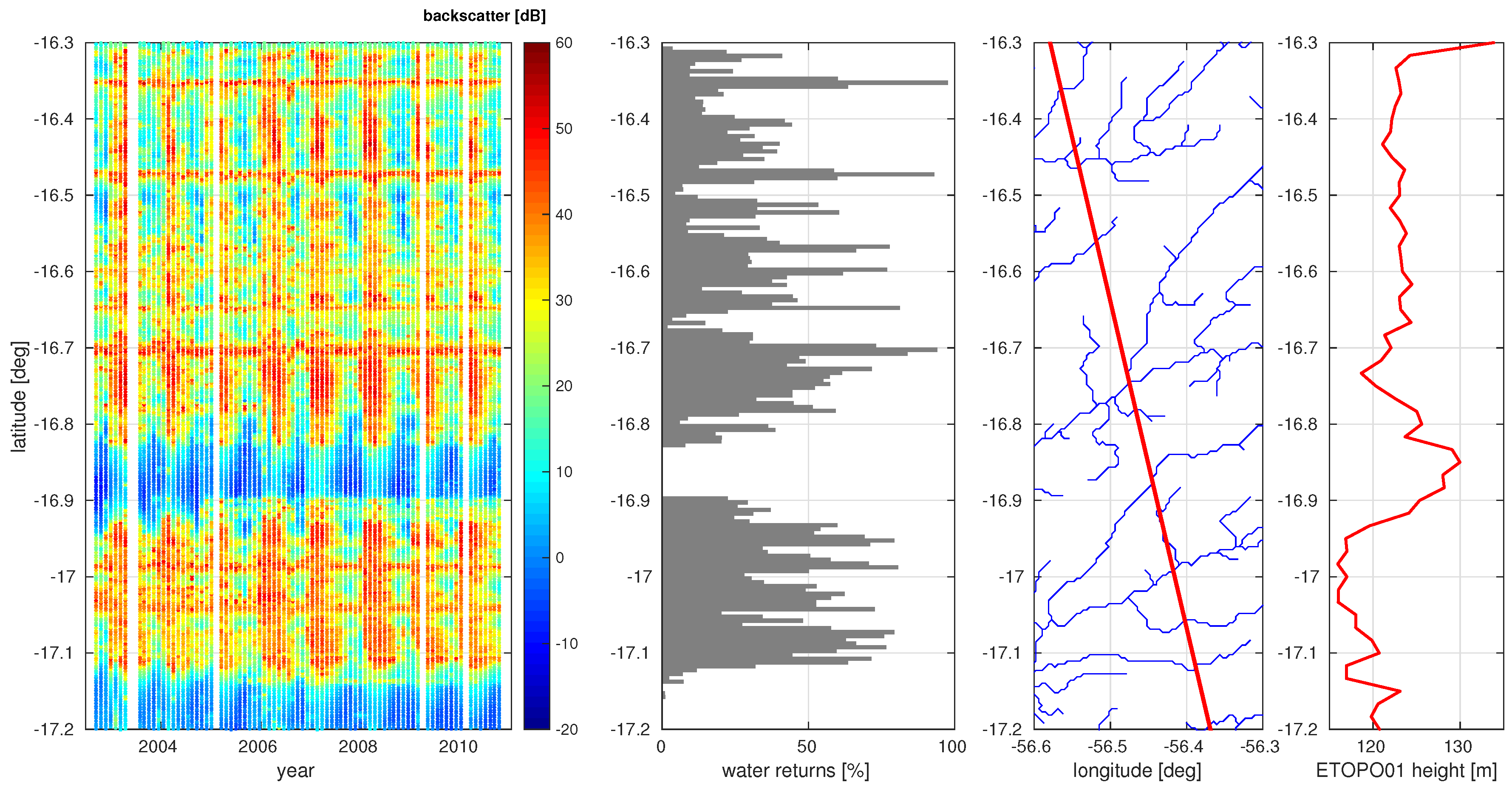 In Figure 2 one can define some points along the track with permanent open water (rivers), since they show high backscatters over the whole time span. For other areas periodic changes of backscatter can be seen indicating regions with seasonal flooding. The location of rivers classified by the altimetry backscatter is in good agreement with the rivers provided by HydroSHEDS [42]. Only one river (at latitude −16.88 degree) cannot be seen by the altimeter. It is not located in a valley and probably very small. It is also not part of the CIA World data bank (WDB II) as used e.g., by Generic Mapping Tools (GMT) [43]. However, this example illustrates that ENVISAT is able to detect rivers and small open water areas without additional external information.