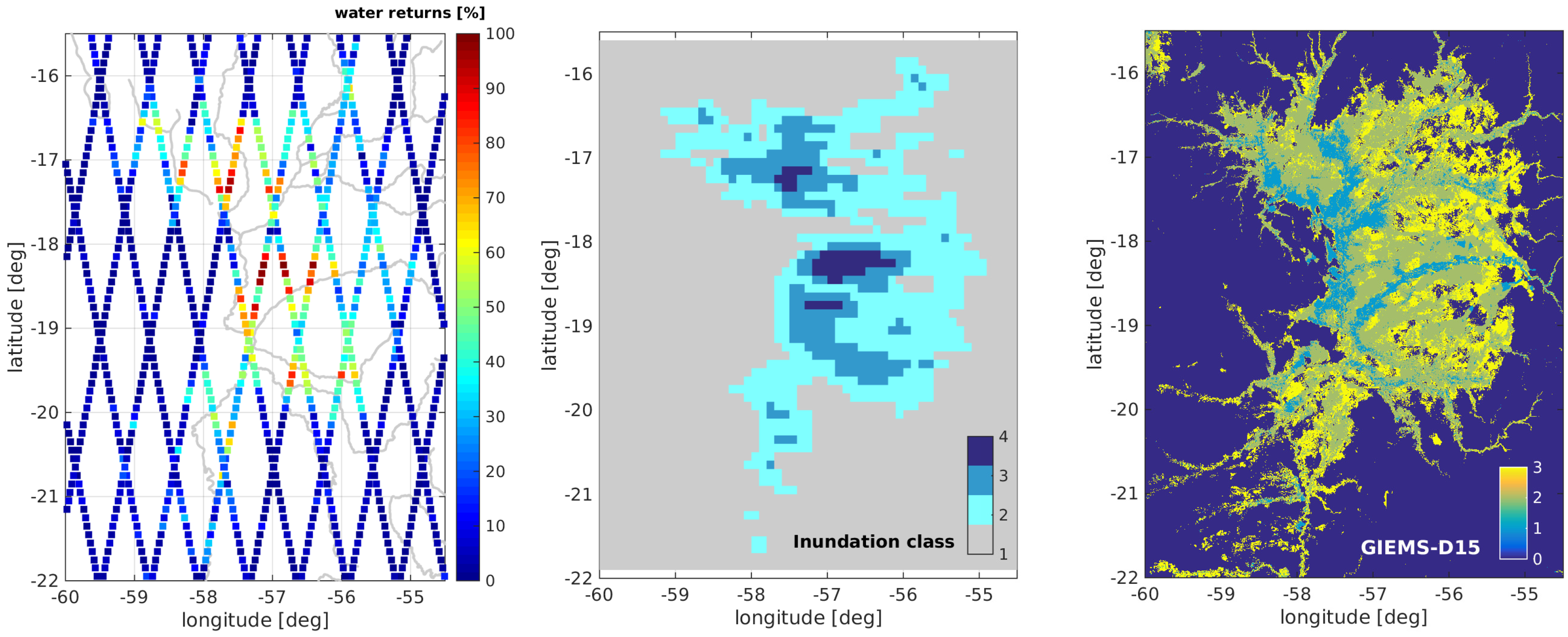 Percentage of water returns per 0.1 degree track segment (left) and derived inundation classes (middle); both from waveform classification. The third plot (right) shows the GIEMS-D15 inundation classes for comparison.
