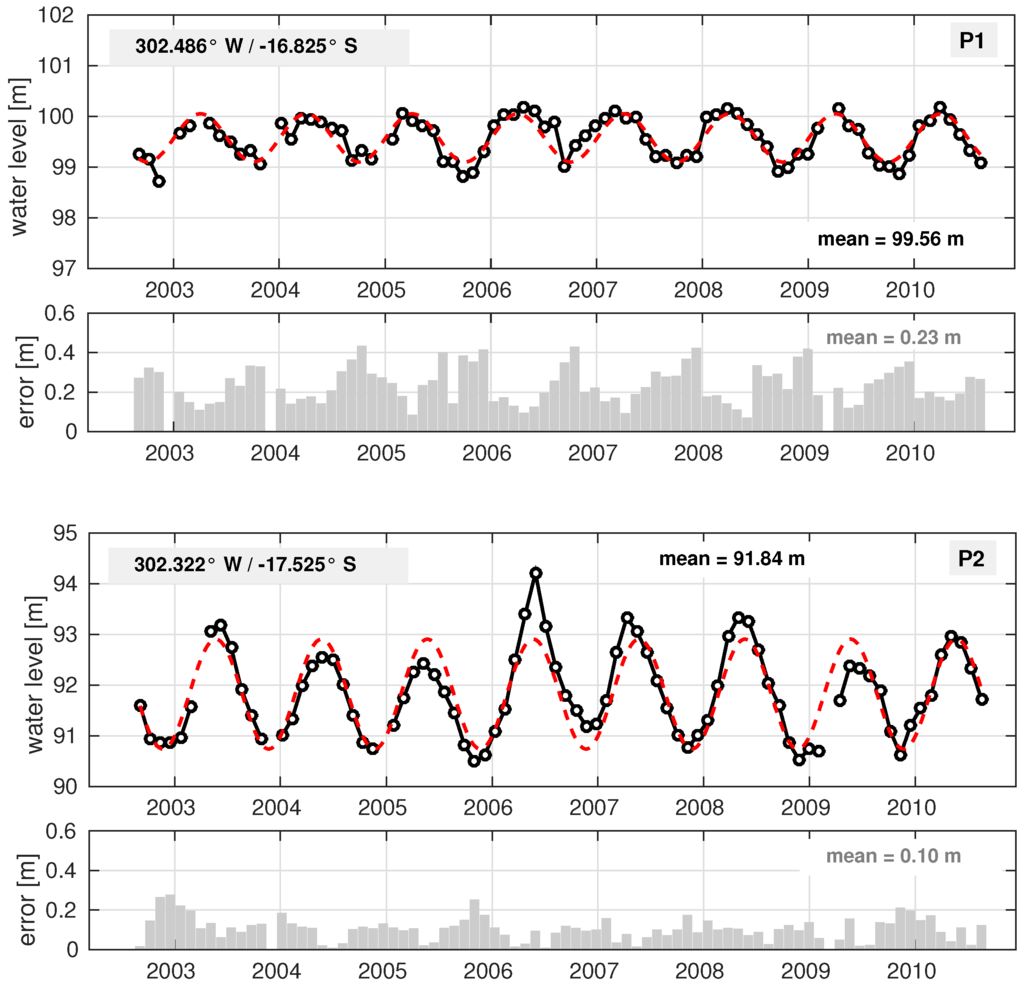 Figure 13 shows the altimetry-derived water level variations (top) and the GRACE-derived LWE (bottom) for the whole study area. The first plot is computed by averaging all time series from