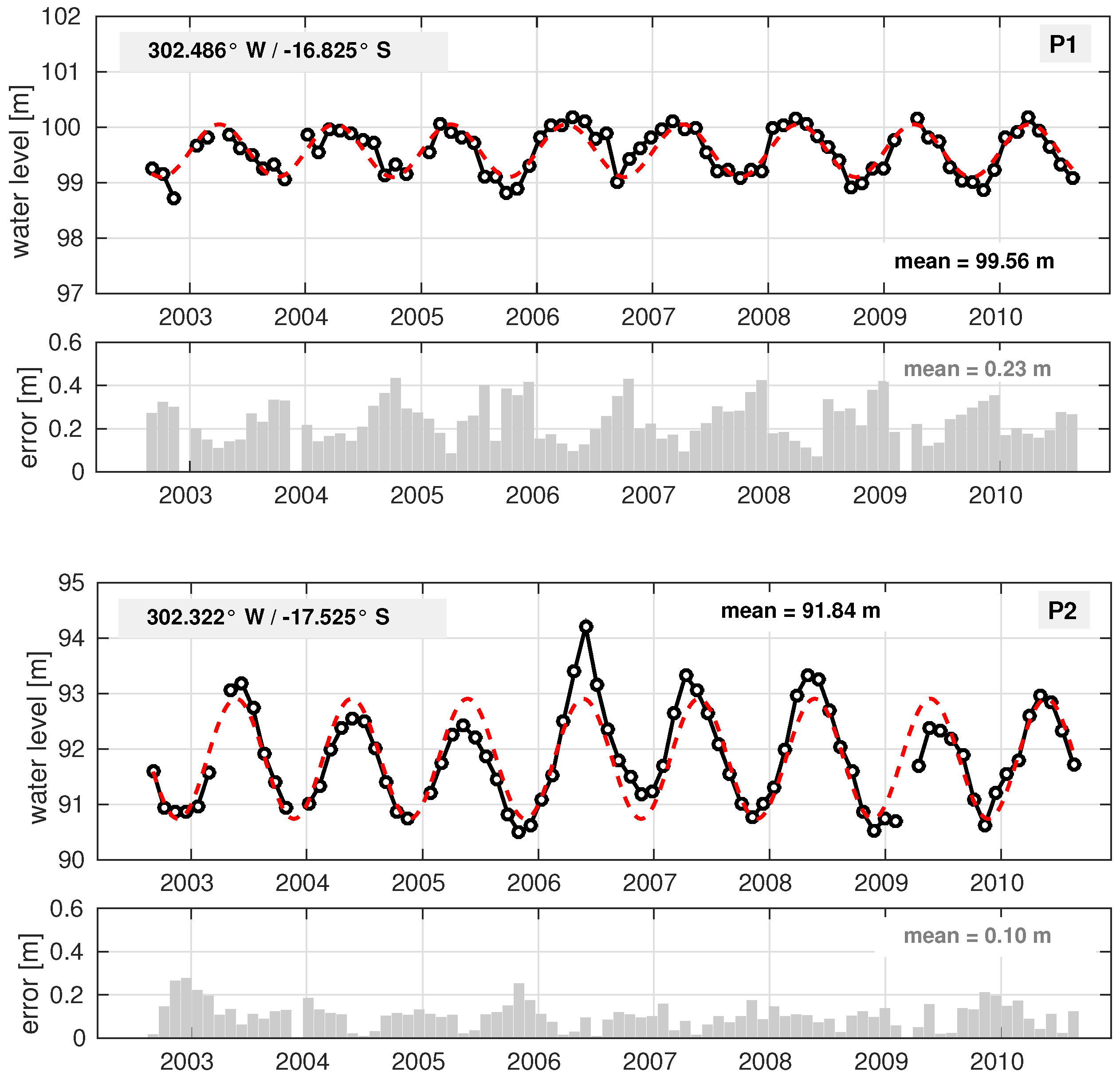 Water level time series (top) and formal errors (bottom) of two track segments (P1 and P2) along ENVISAT Track 220. The estimated water levels are given in black. The red dotted lines indicate fitted annual signals with constant amplitudes. For the station locations refer to Figure 1.