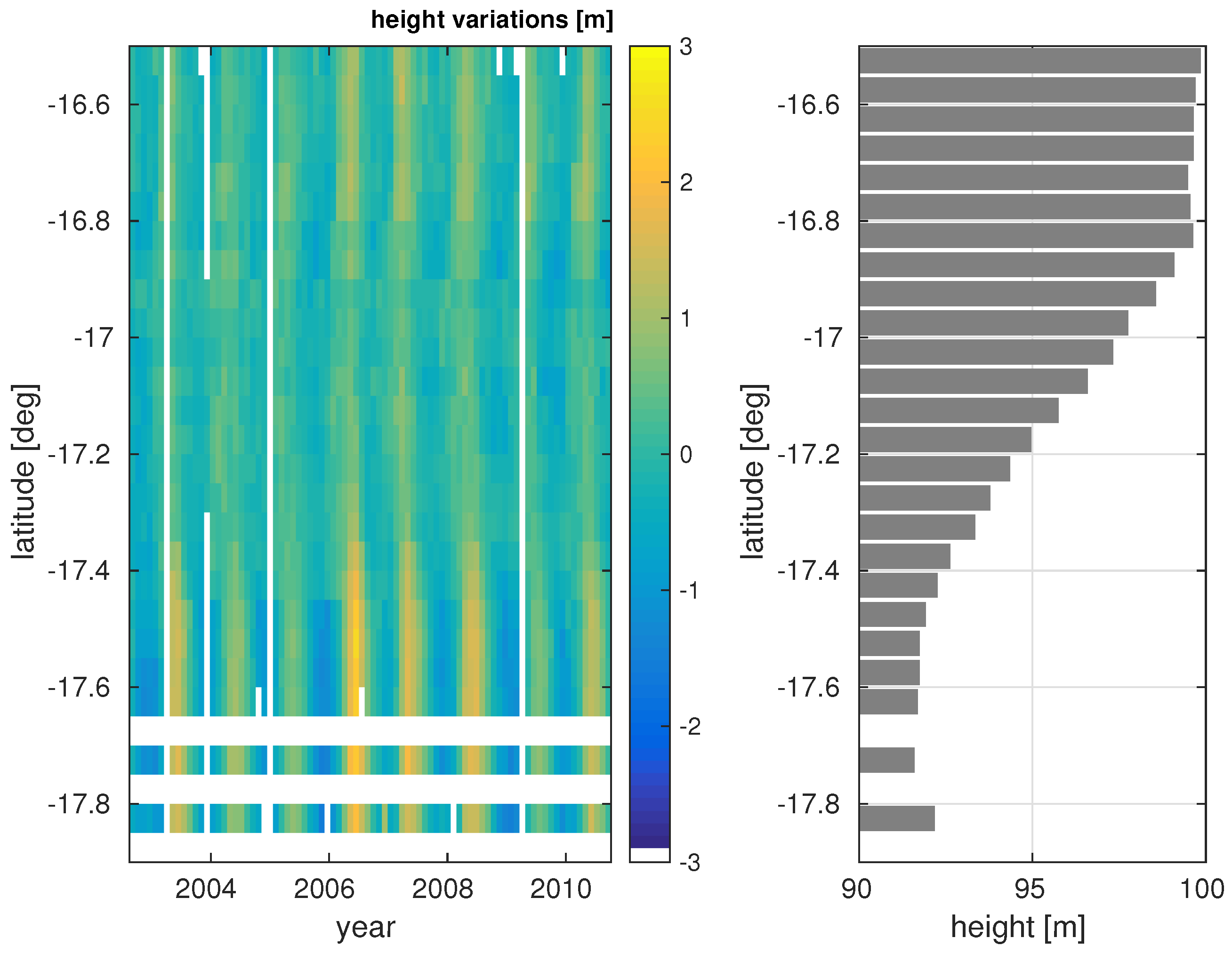 Water levels along ENVISAT Track 220. The right part shows the mean heights per track segment. The height variations (heights subtracted by the mean height) are plotted in the left part of the Figure.