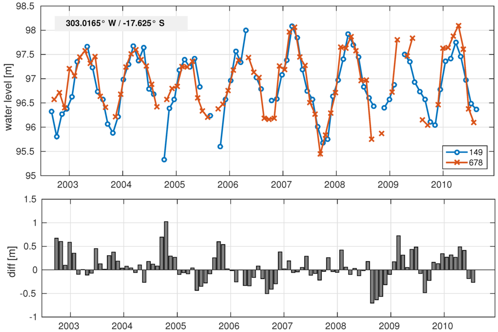 14]. The mean standard deviation of the time series is 0.28 m for pass 678 and 0.25 m for pass 149, respectively. Thus, the standard deviation of the difference