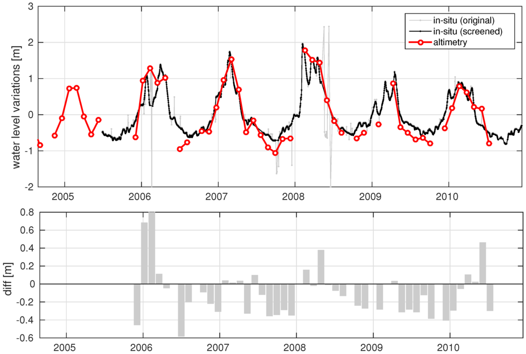 Figure 7 shows the two time series for crossover point 3 and their differences. Even if differences of about 1 m are visible, the RMS difference of 32 cm is acceptable and in the same order of magnitude with most river crossings [