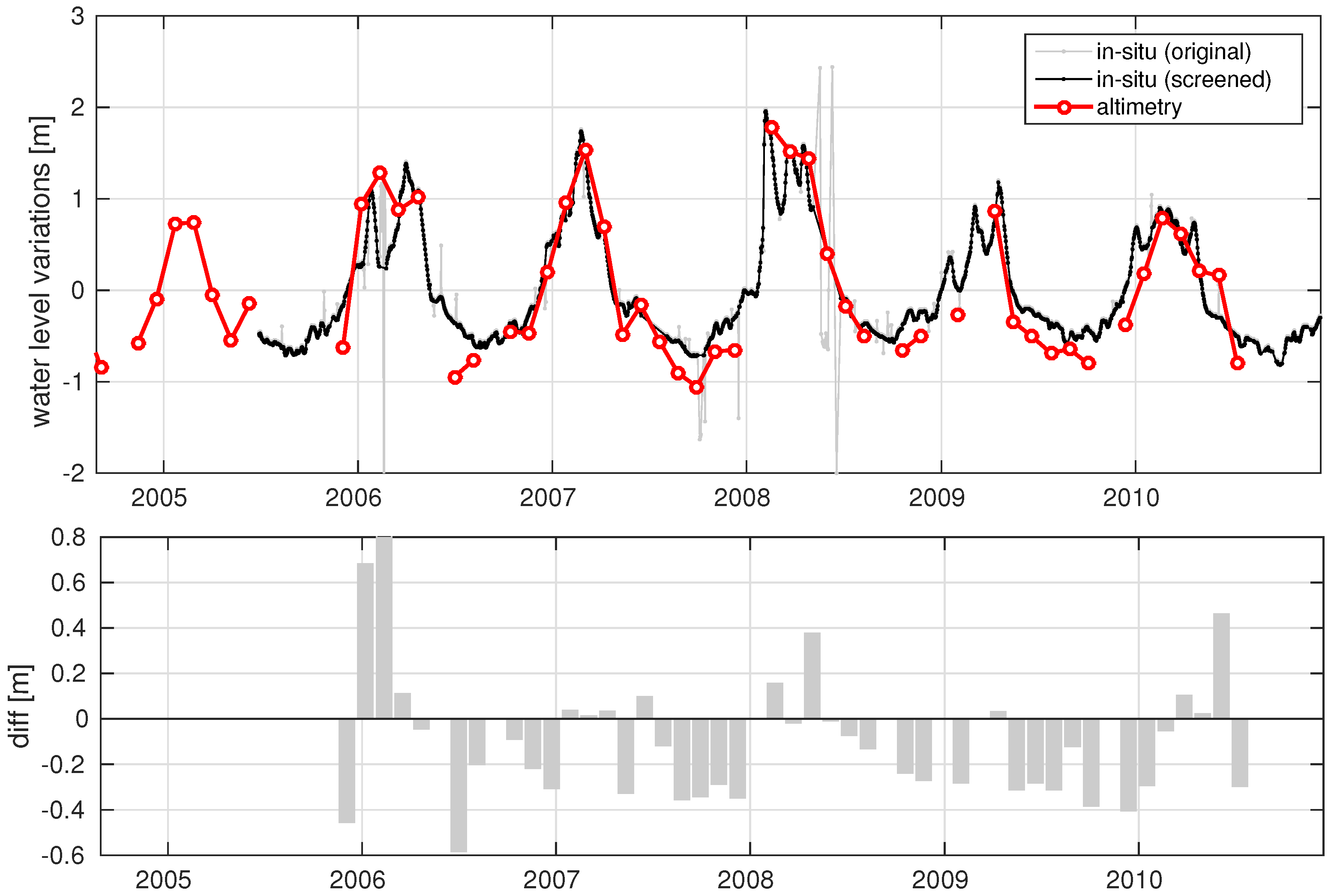 Water level time series of gauge at Sao Jeronimo (black) and nearest altimetry track (red). The gray lines in the top plot show the original in situ time series without outlier screening. The bottom plot illustrates the differences between altimetry and gauge.