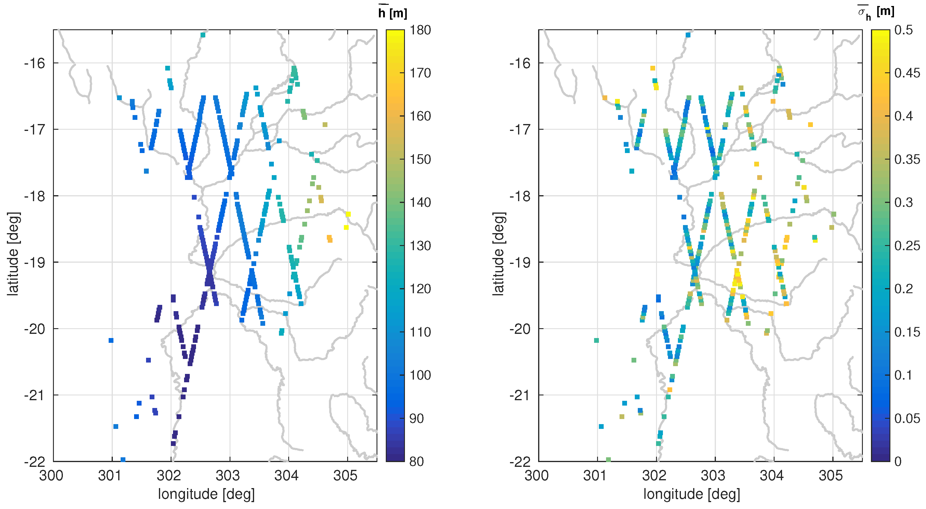Average heights of valid altimeter time series (left) and its mean error estimates (right).