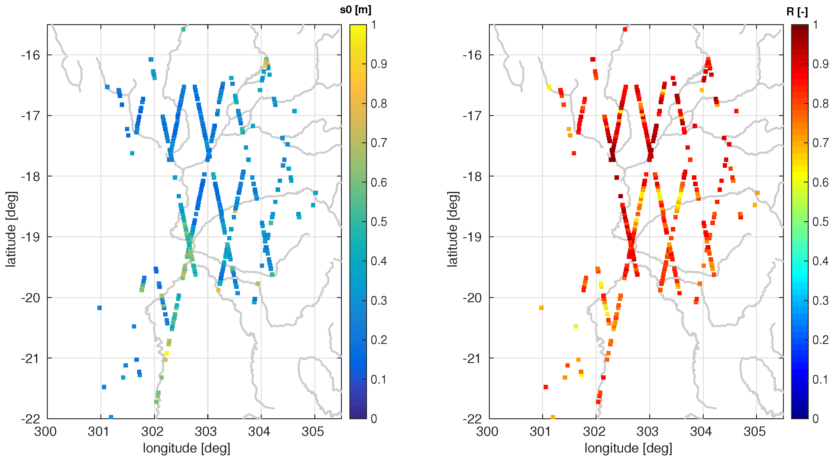 In the previous section single water level time series and their accuracies have been analyzed. Now, all valid datasets will be exploited together in order to allow for an interpretation of the water dynamics within the whole Pantanal. However, in order to get reliable results it is important to use only those time series that are trustworthy and of high precision. Thus, for all further analysis only time series fulfilling three criteria will be used: (1) percentage of water returns larger than 20% (at least occasionally flooded); (2) number of valid points in time series larger than 50 (about half of the theoretically possible epochs); and (3) mean formal error smaller than 0.5 m (78% of all valid time series). The remaining number of time series is 336, about 17% of all possible track segments in the study area. Most time series (70%) are rejected because they are located above mostly dry terrain (inundation class 1, first criteria). The averaged height of each point and its mean formal error is plotted in Figure 9. On the left-hand side one can see the basic topography of the region with decreasing terrain from North-East to South-West and the lowest part around the Paraguay river. This structure can also be seen in the error estimates (right-hand side) but with much more noise due to local conditions.