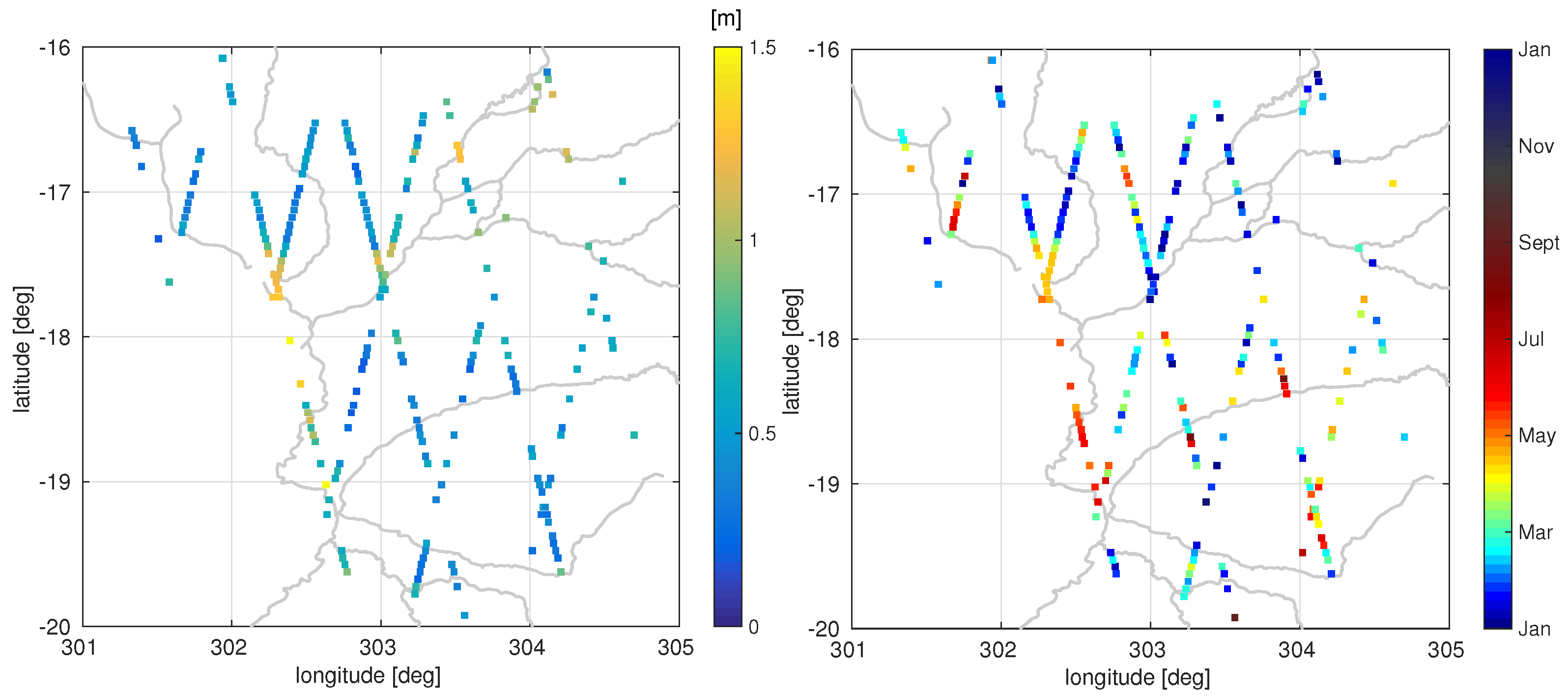 288 (85.7%) time series can be fitted with 0.5 m and 302 (89.9%) reach a correlation coefficient larger than 0.7. When both criteria are fulfilled it is assumed that the signal can be well represented by the harmonic fit. This is the case for 255 (75.9%) time series, mainly located in the northern part of the Pantanal. For 232 of these stations, the main oscillation has a period of one year. The rest have other dominant periods. These stations are all located in the South of the Pantanal region. Figure 11 shows the amplitudes and phases of the annual signal ( in Equation (2)) of each station with a reliable Fourier fit. The estimated amplitudes range between 0.1 and 1.5 m, reflecting only seasonal behavior. The month of maximum water level varies between January and June with only a few time series showing maxima later in the year. Near the Rio Paraguay (flowing from North to South between 302 and 302.5 degree longitude) neighboring track segments are nicely correlated with each other (for both parameters). However, in the East of the study area the phase of the fitted signal show larger point-to-point variations, probably due to the direction of the river flow in this region (nearly perpendicular to the satellite tracks).