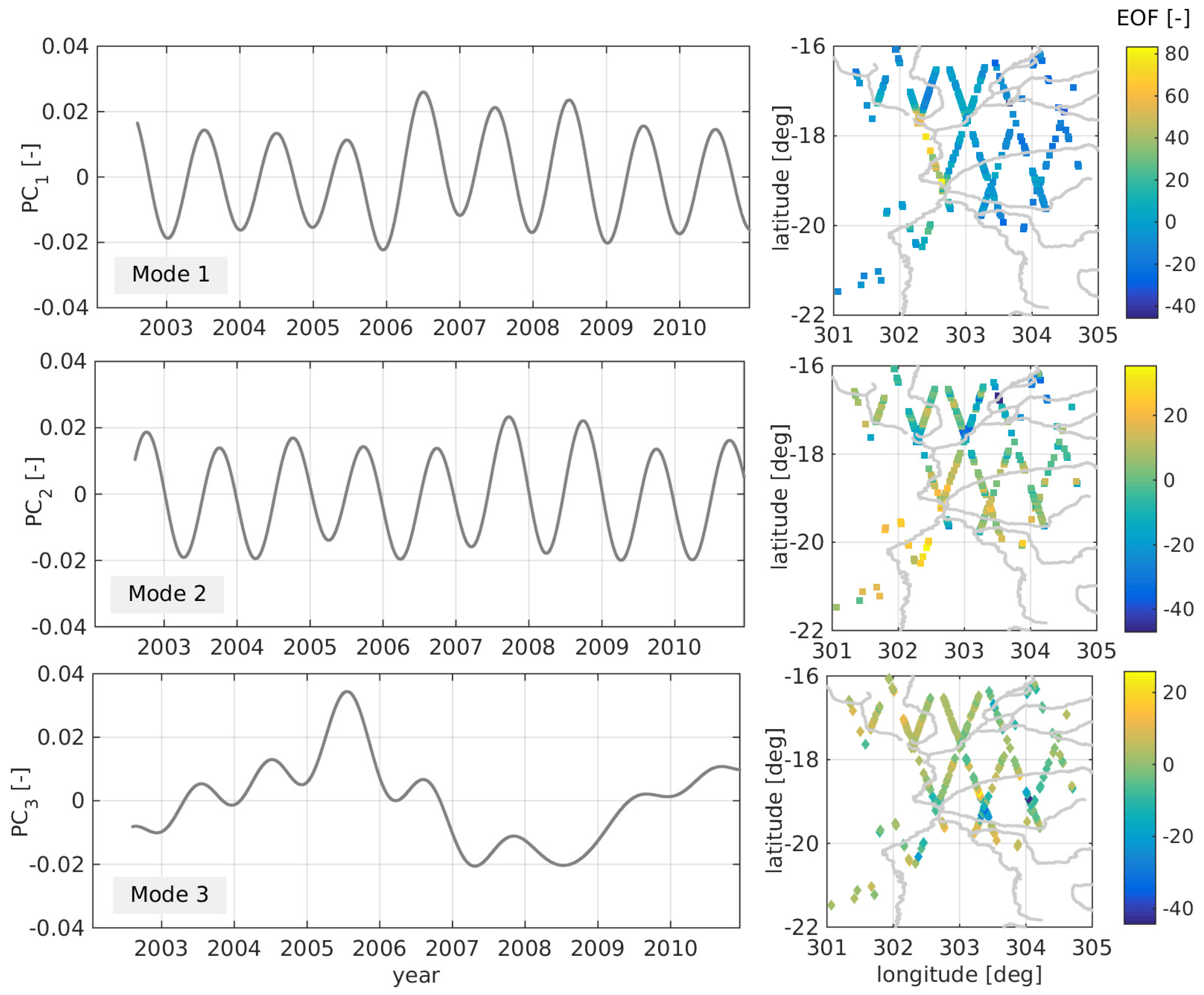 By PCA, spatial-temporal variations can be analyzed based on the covariances between the time series. For this dataset, three modes are required to explain nearly 80% of the allover variance of the system. The relative contribution per mode is given in Table 5. In order to describe 95% of the signal variance at least 10 modes would be necessary. For this study, the first three modes are used for describing the main spatial and temporal structures of the water level variations of the Pantanal. The resulting temporal and spatial patterns are displayed in Figure 12. The standard deviations of the residuals per time series remain smaller than 0.4 m, except for single outliers. The first two modes are dominated by annual variations with different phases. The first mode shows maxima in the mid of the year around June, mainly in the central west of the area (northern Rio Paraguay), whereas the second mode represents water maxima in spring (around March) along the Piquiri river (negative values in the spatial plot) and later in the year at the southern Paraguay (positive values). Mode 3 reflects exceptional events focused in the South of the Pantanal along the Rio Negro (mode 3). The stations along the Rio Negro show negative values (drought) before 2007, especially in 2005, and higher water in 2007 and 2008. However, the contribution of mode 3 to the overall signal is very small and should not be overvalued.
