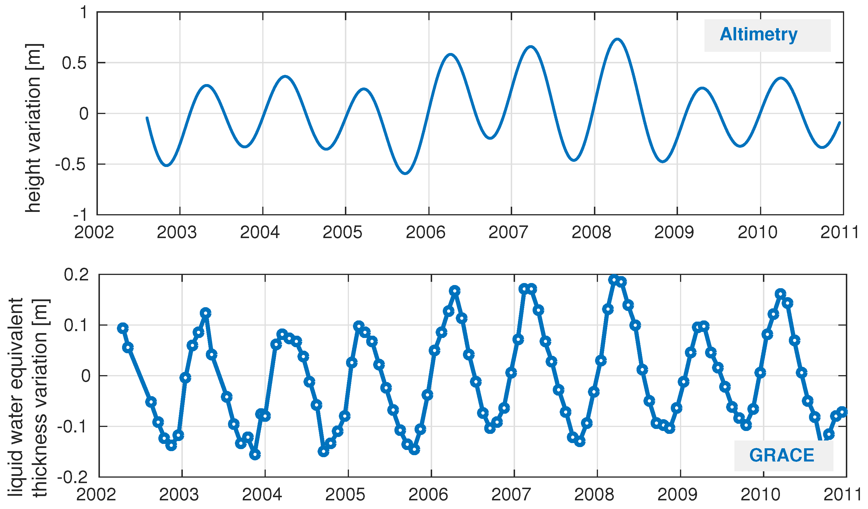 Mean water variations for the whole Pantanal region. The top plot shows the mean water level variations derived by ENVISAT altimetry. The bottom plot illustrates GRACE-derived mass changes converted to liquid water equivalent thickness variations.