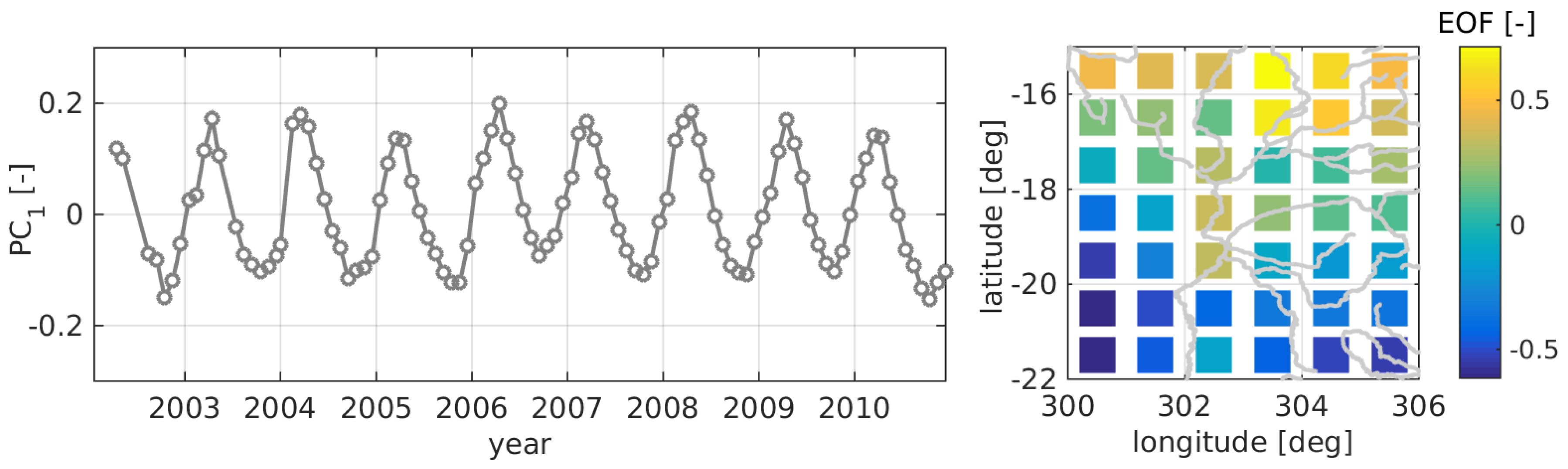In a next step, a PCA is applied to the GRACE dataset (given on a 1-degree grid) in order to analyze the spatial variability of the data. Figure 14 illustrates the result. The first PCA mode represents 90.8% of the signal, thus, all further modes are negligible and will not be interpreted. Comparing the spatial pattern to the altimetry result (Figure 12) one can detect some congruences. The largest GRACE amplitudes can be seen in the northern part of the region and along the River Paraguay. This also holds for altimetry even though separated to different modes: mode 1 shows the largest amplitudes along the Paraguay and mode 2 in the northeast (Rio Cuiaba). However, the altimetry results indicate higher water level variations along the Paraguay than along the Rio Cuiaba. Moreover, only moderate amplitudes are visible in the north and northwest. Probably, the high GRACE amplitude in this region is due to other water reservoirs (such as groundwater or soil moisture). Moreover, GRACE seems not able to resolve the different phasing of the surface water since only one seasonal mode is detectable.