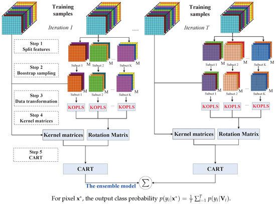 The success of MCSs (Multiple Classifier Systems) depend on not only the choice of base classifier, but also the diversity within the ensemble [12,44]. Aiming at improving both the diversity and classification accuracies of the DT classifiers within the ensemble, we propose a novel ensemble method, i.e., Rotation Forest with KOPLS (RoF-KOPLS), which aims at combining the advantages of KOPLS and RoF together. The proposed method can be summarized with the following steps (see Algorithm 2 and Figure 1). In the training phase, the feature space is randomly split into K disjoint subspace. For each subset, the initial training samples with 75% are drawn from the training data by using a bootstrap sampling method. KOPLS is applied to each subspace to get the coefficients . In the next step, the kernel matrices of are calculated, and an individual classifier is trained on the extracted features . In the prediction phase, the kernel matrices between and a new sample is generated firstly. Then, the new transformed dataset is classified by the ensemble, and the final result will be assigned to the corresponding class by the majority voting rule. We expect that RoF-KOPLS can improve the performance of RoF-OPLS by introducing further diversity by performing a kernel feature extraction within the ensemble. The base classifiers in RoF-KOPLS are expected to be more diverse compared to these in RoF-OPLS, thus yielding more powerful ensemble. Furthermore, depending on the types of kernel function, RoF-KOPLS can be more specific, i.e., RoF with linear kernel (RoF-KOPLS-Linear), RoF with polynomial kernel (RoF-KOPLS-Polynomial), and RoF with RBF kernel (RoF-KOPLS-RBF).