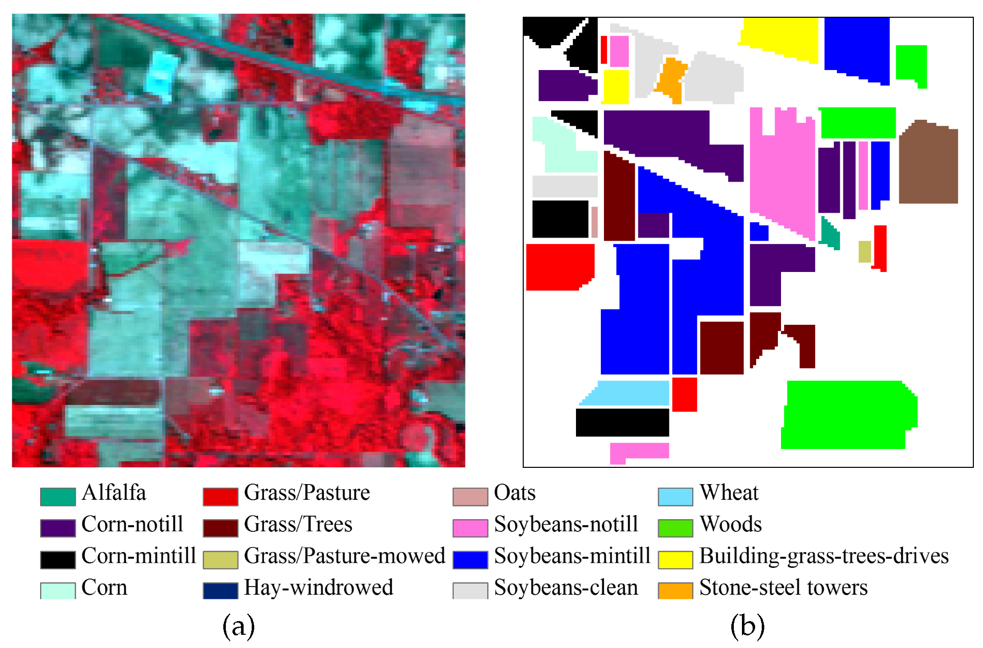 AVIRIS Indian Pines data set. (a) Three-band color composite (bands 57, 27, 17); (b) Ground-truth map containing 16 mutually exclusive land-cover classes. The legend of this scene is shown at the bottom.