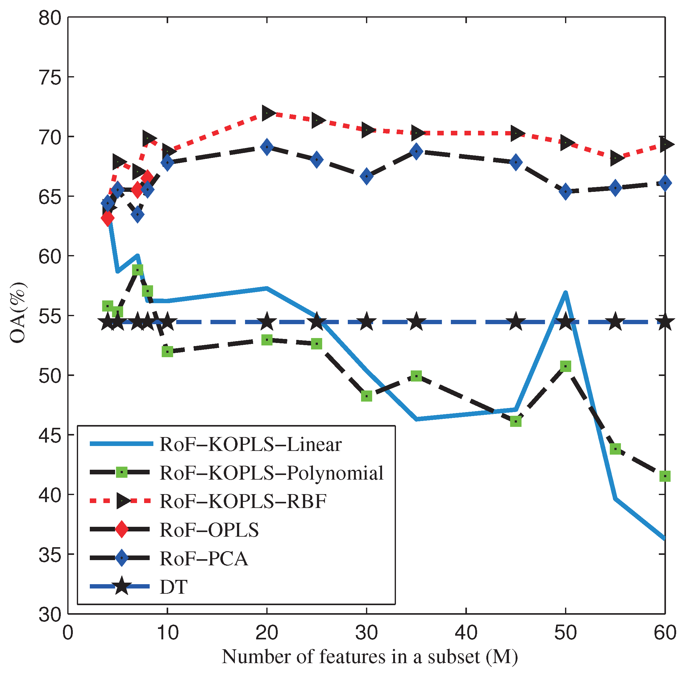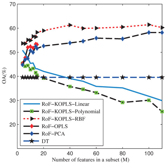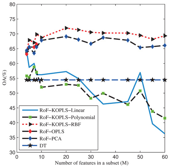 Indian Pines AVIRIS Image. OAs obtained by DT, RoF-PCA, RoF-OPLS, RoF-KOPLS-Linear, RoF-KOPLS-Polynomial, RoF-KOPLS-RBF with different number of M.