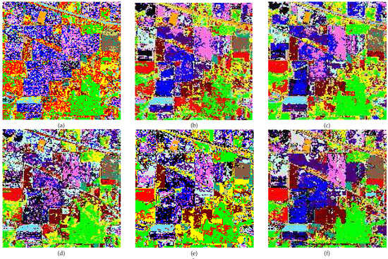 Classification maps of the Indian Pines AVIRIS image (only one Monte Carlo run). OAs of the classifiers are presented as follows: (a) DT (40.20%); (b) RoF-PCA (57.39%); (c) RoF-OPLS (54.97%); (d) RoF-KOPLS-Linear (45.39%); (e) RoF-KOPLS-Polynomial (42.80%); (f) RoF-KOPLS-RBF (64.25%)