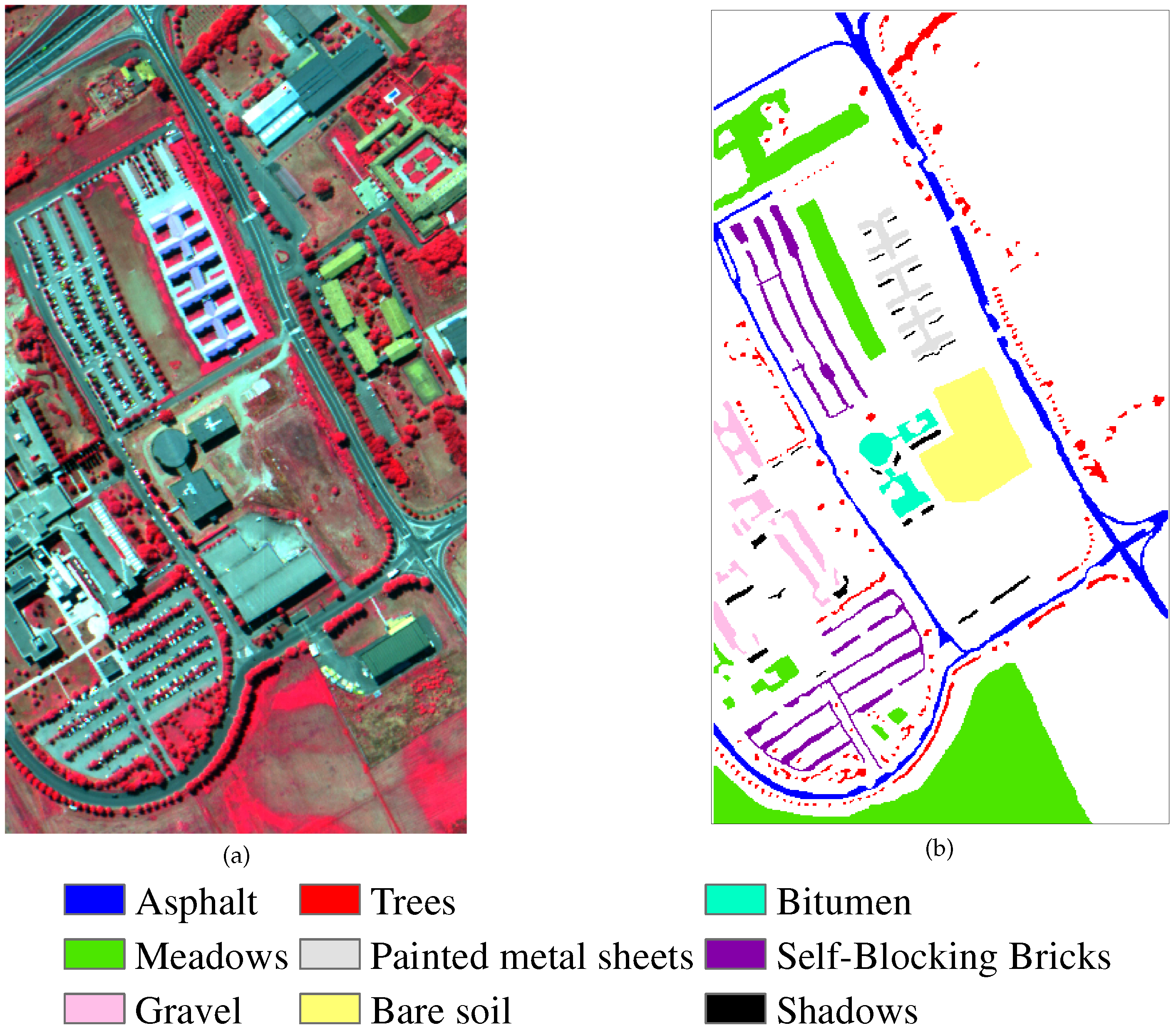 ROSIS University of Pavia data set. (a) Three-band color composite (bands 102, 56, 31); (b) Reference map containing 9 mutually exclusive land-cover classes. The legend of this scene is shown at the bottom.