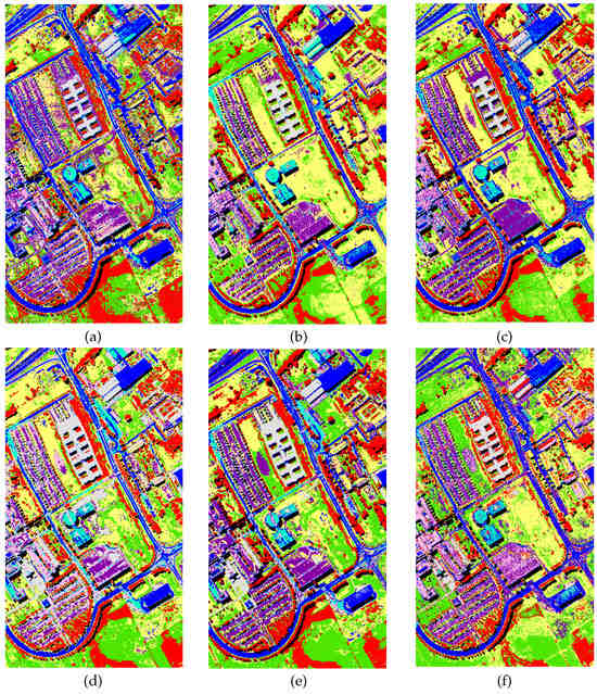 Classification maps of the University of Pavia ROSIS image (only one Monte Carlo run). OAs of the classifiers are presented as follows: (a) DT (54.06%); (b) RoF-PCA (66.0%); (c) RoF-OPLS (65.24%); (d) RoF-KOPLS-Linear (57.26%); (e) RoF-KOPLS-Polynomial (60.57%); (f) RoF-KOPLS-RBF (70.65%).