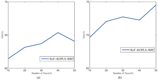 Sensitivity to the change of the number of trees. (a) Indian Pines AVIRIS image; (b) University of Pavia ROSIS image.